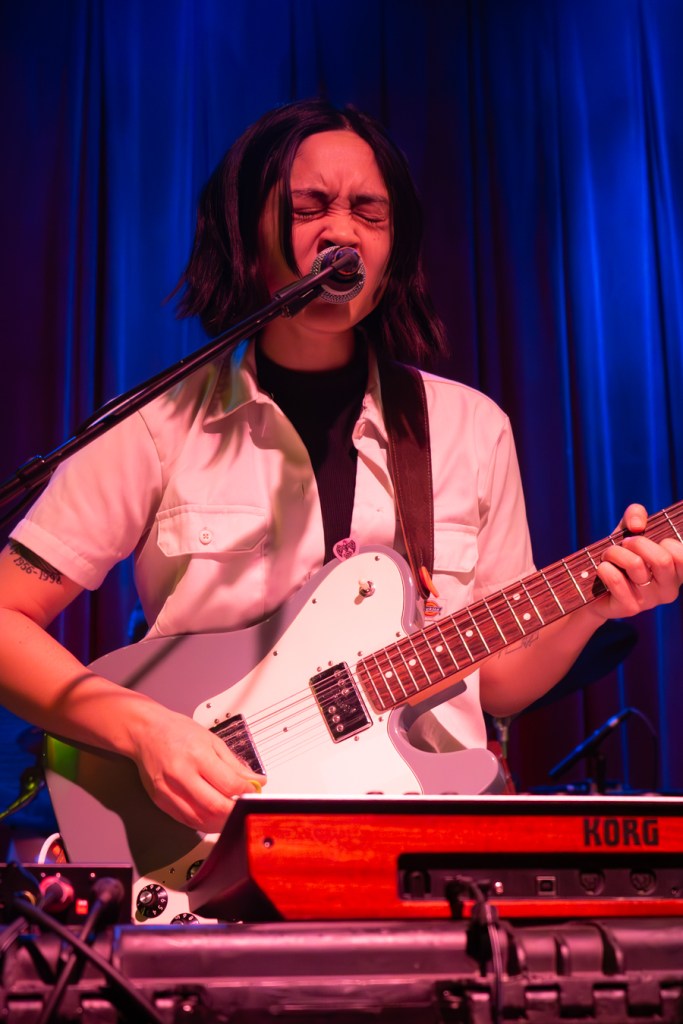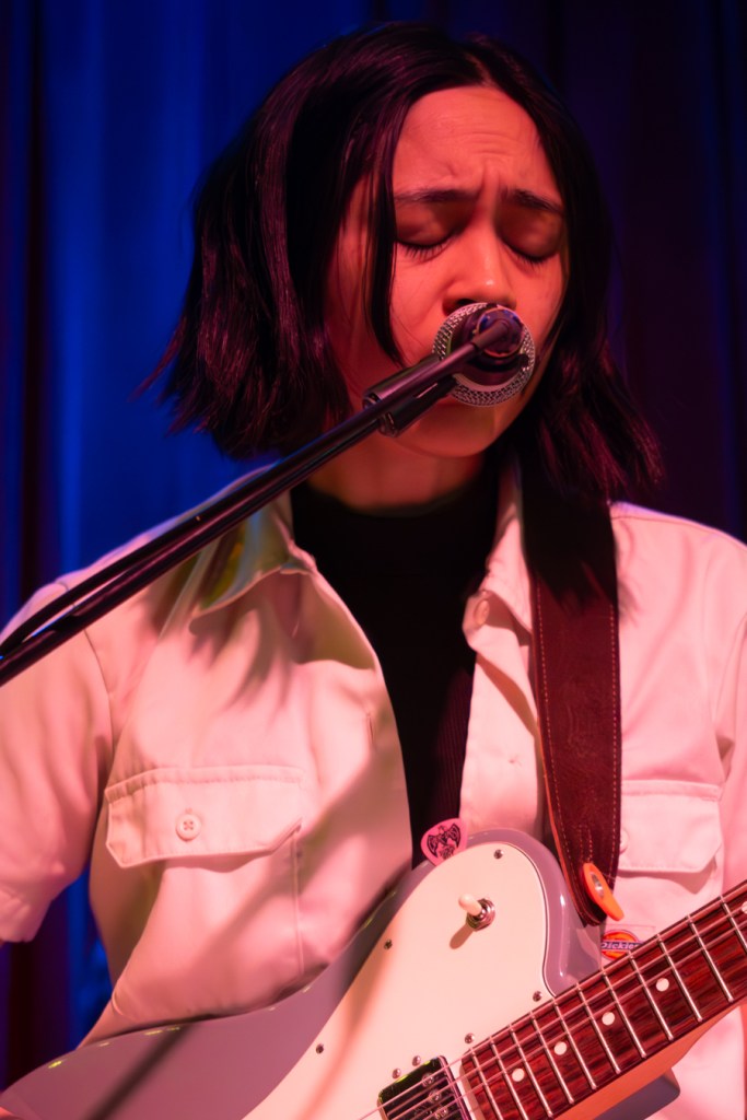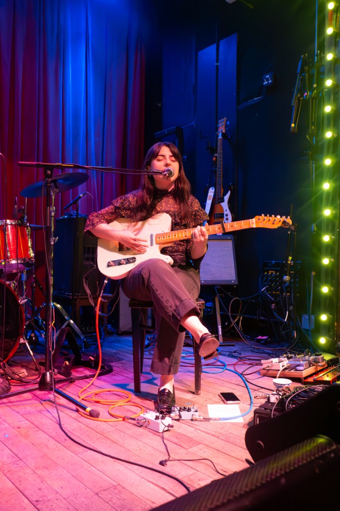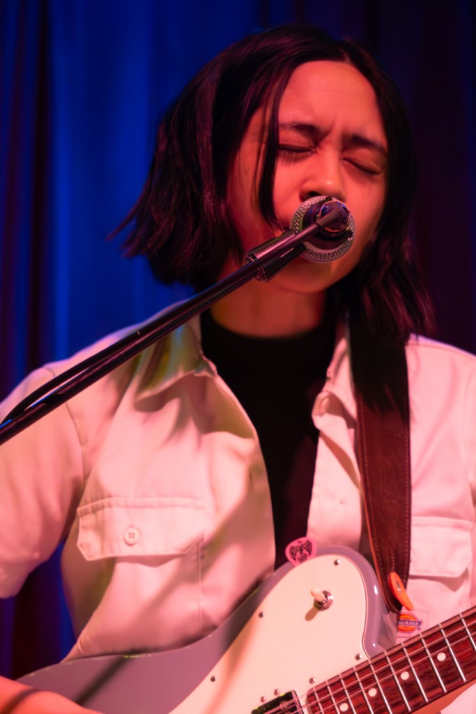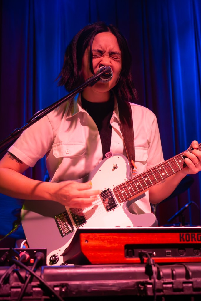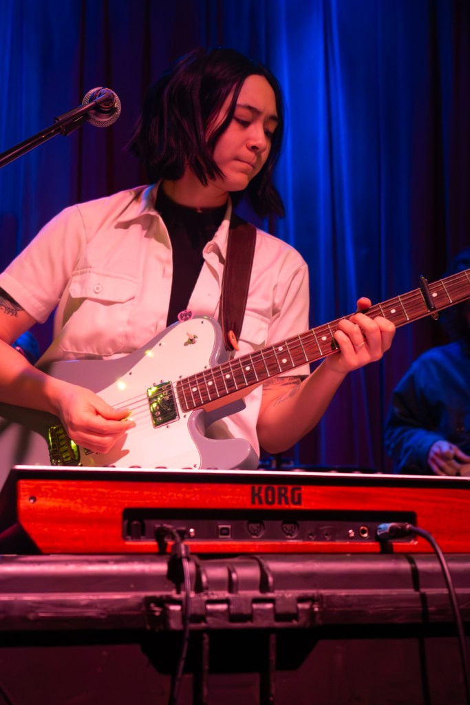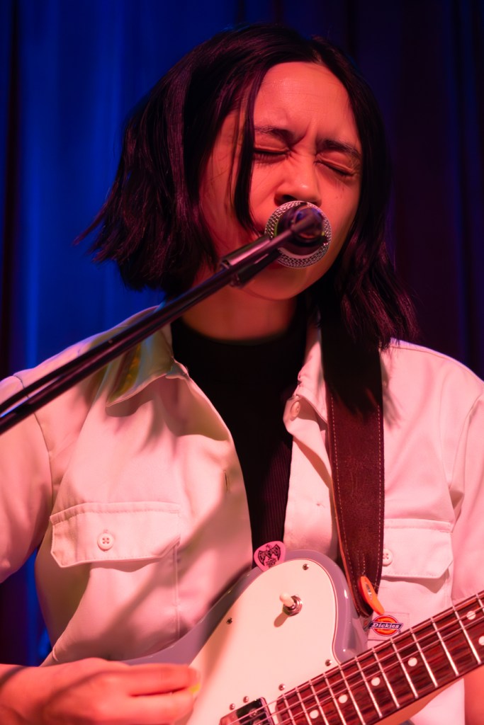 Union Pool was a fantastic choice for the show, as it set a cozy and relaxed environment for the evening. After doors opened at 7pm, audience members slowly streamed into the performance room with drinks and merch in hand. Sofia went on first and played an acoustic set; the audience respectfully swayed and cheered during and after each song. In contrast, Work Wife brought a full band sound to the stage. This allowed for a seamless transition to Mini Trees’s set, which featured a mix of both quieter and more upbeat songs.