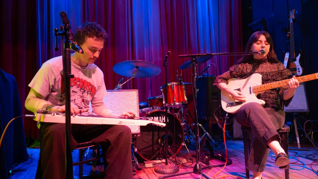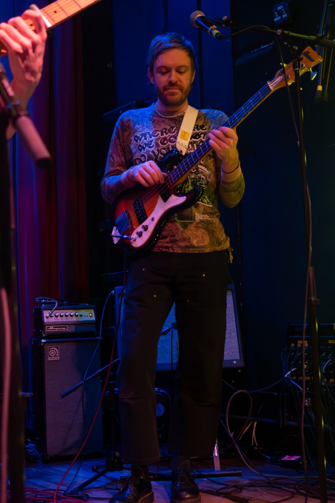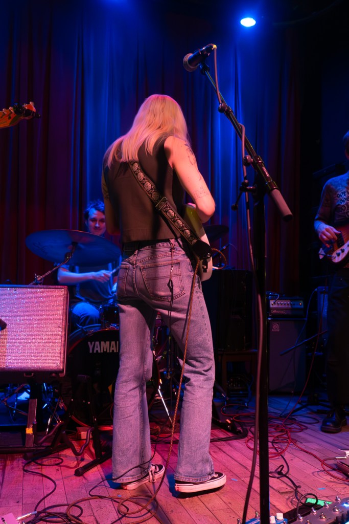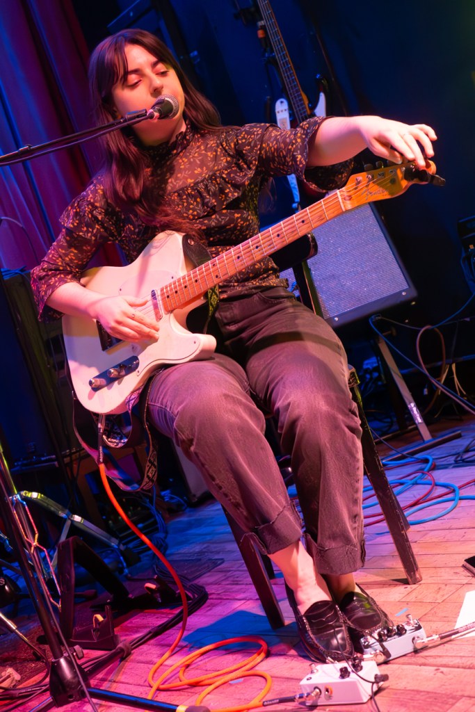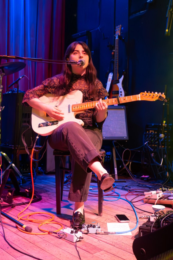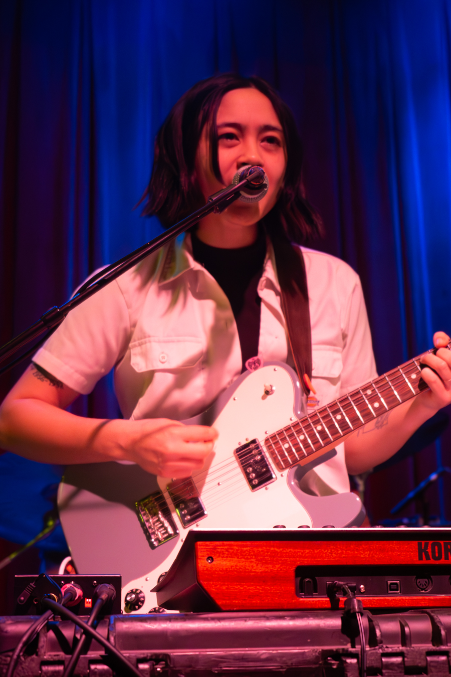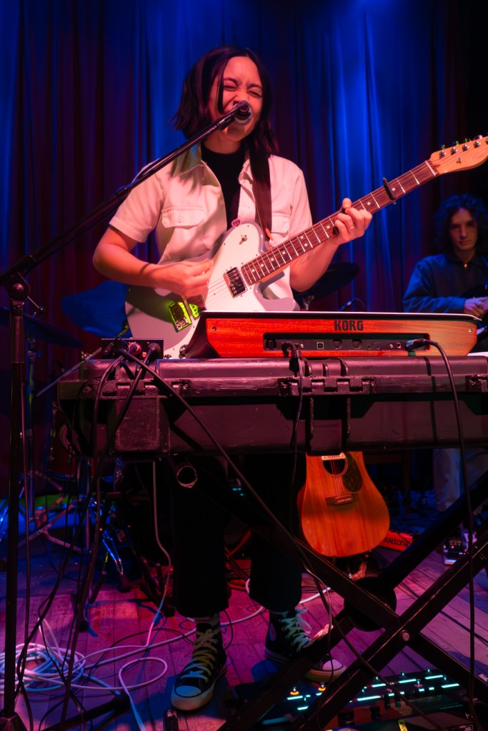 Union Pool was a fantastic choice for the show, as it set a cozy and relaxed environment for the evening. After doors opened at 7pm, audience members slowly streamed into the performance room with drinks and merch in hand. Sofia went on first and played an acoustic set; the audience respectfully swayed and cheered during and after each song. In contrast, Work Wife brought a full band sound to the stage. This allowed for a seamless transition to Mini Trees’s set, which featured a mix of both quieter and more upbeat songs.