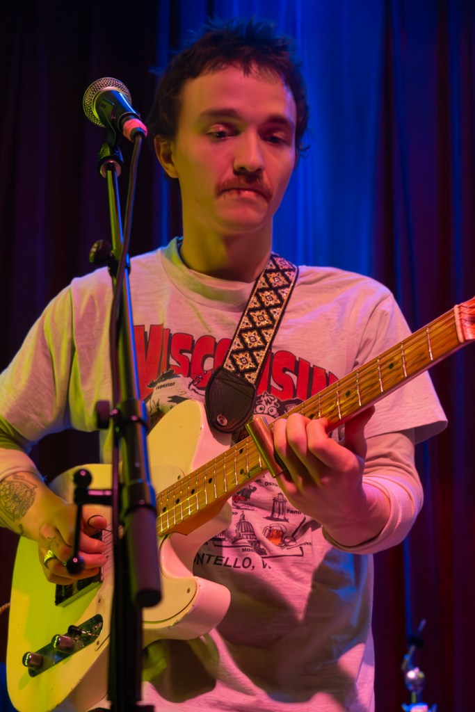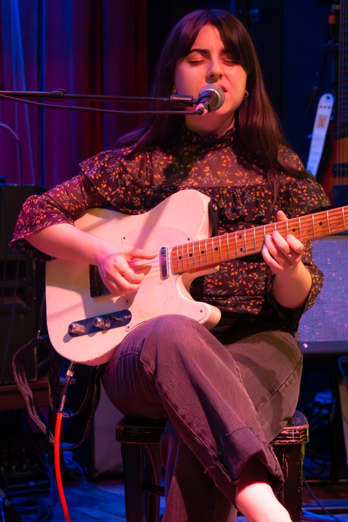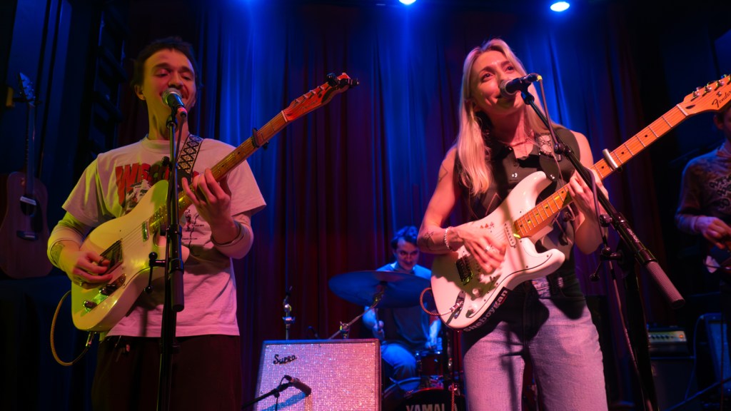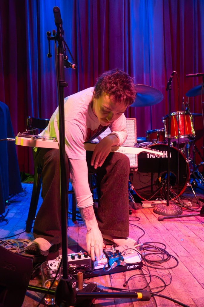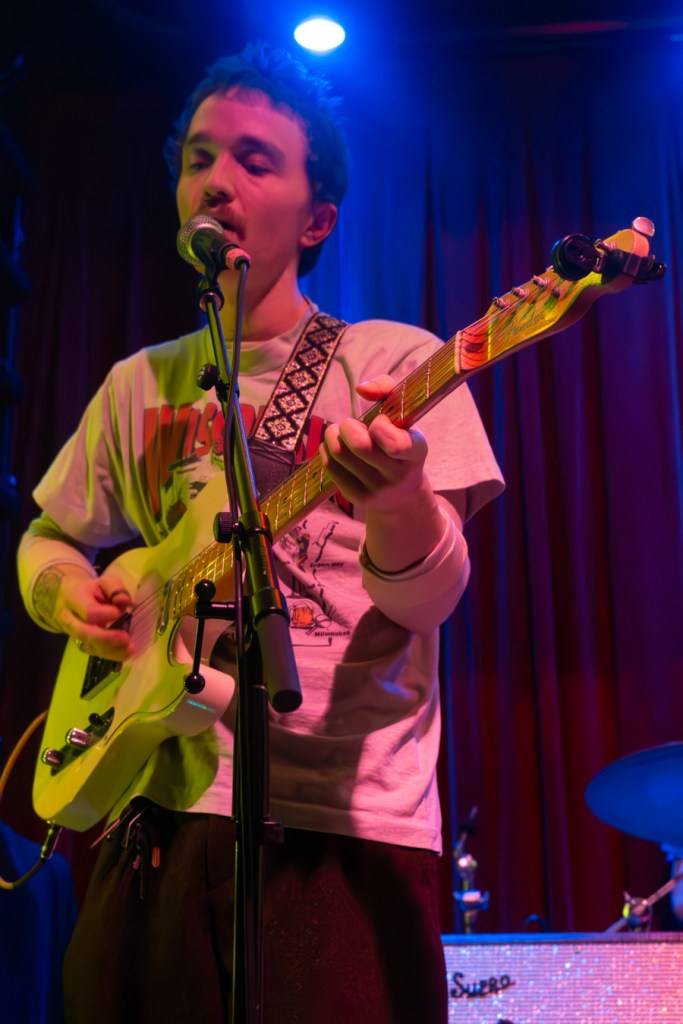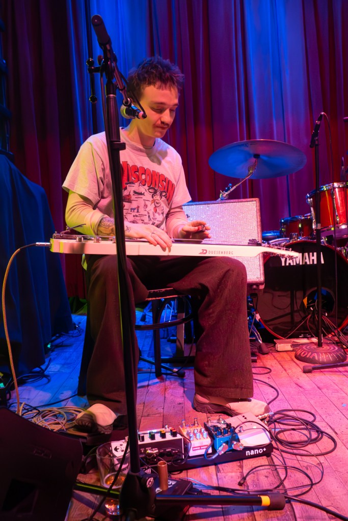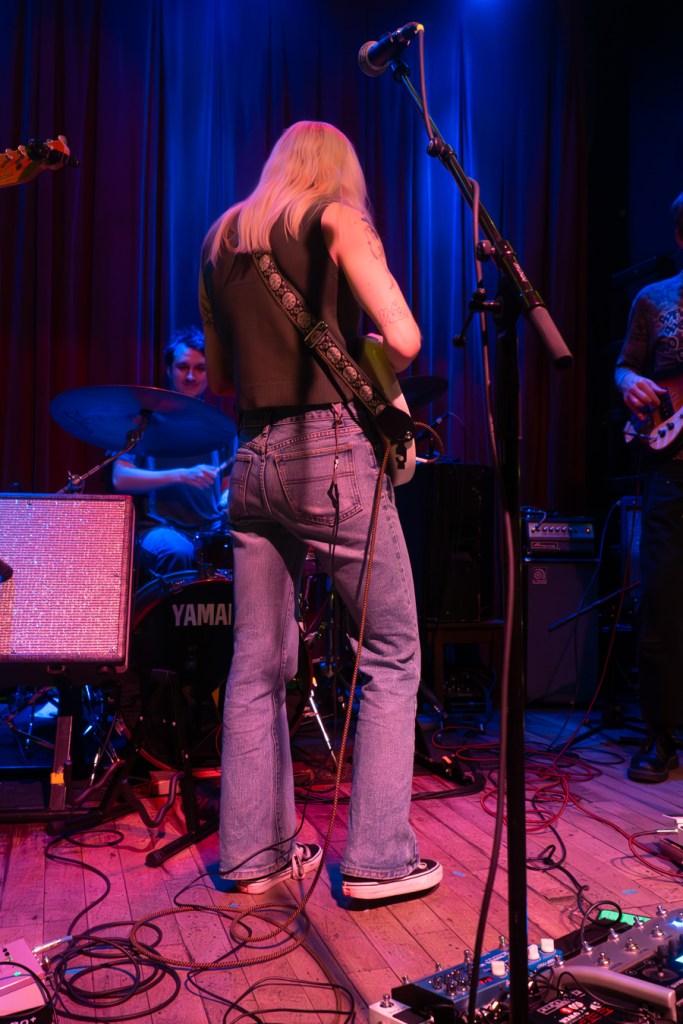 Union Pool was a fantastic choice for the show, as it set a cozy and relaxed environment for the evening. After doors opened at 7pm, audience members slowly streamed into the performance room with drinks and merch in hand. Sofia went on first and played an acoustic set; the audience respectfully swayed and cheered during and after each song. In contrast, Work Wife brought a full band sound to the stage. This allowed for a seamless transition to Mini Trees’s set, which featured a mix of both quieter and more upbeat songs.