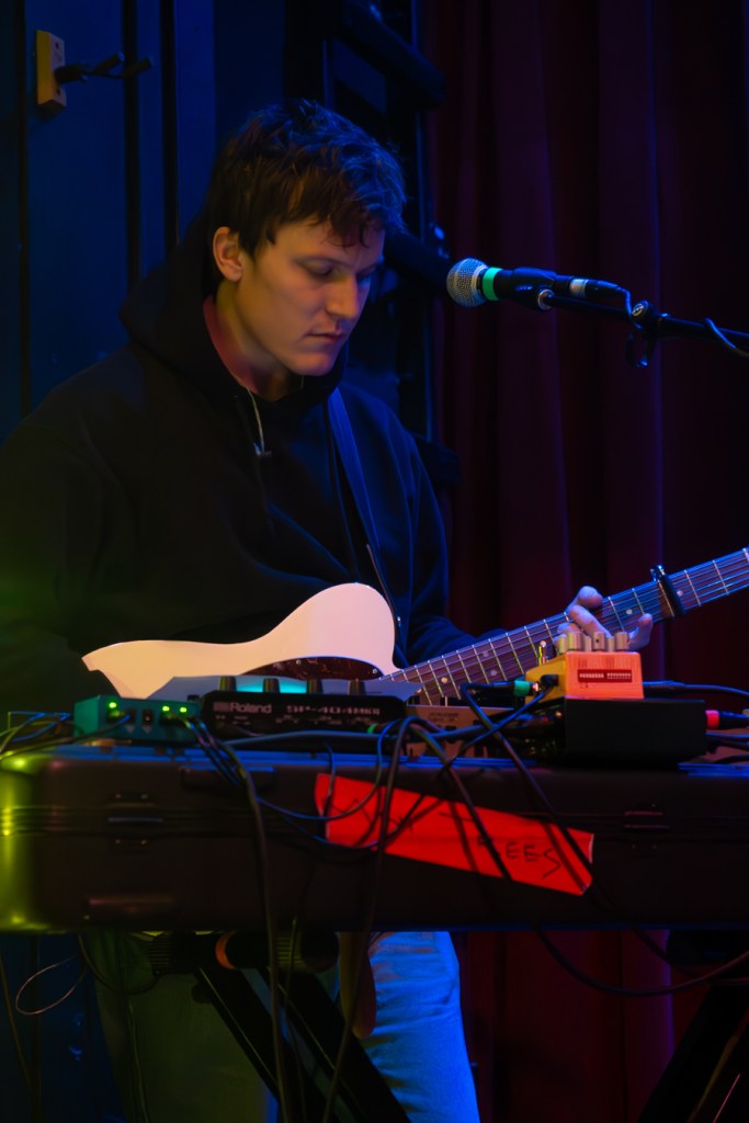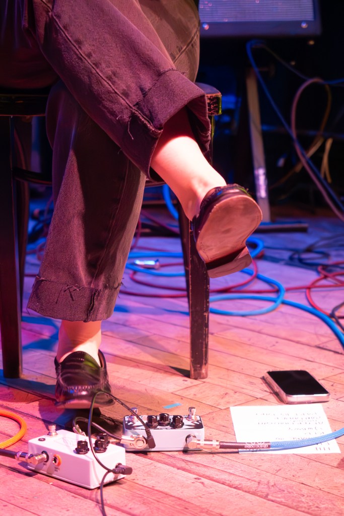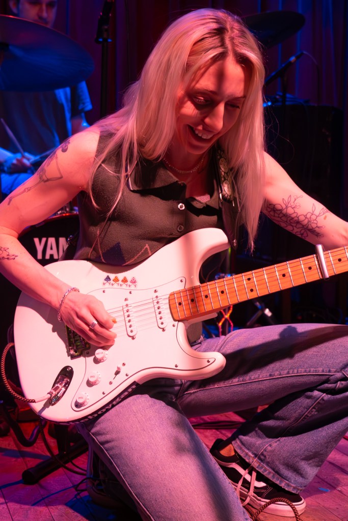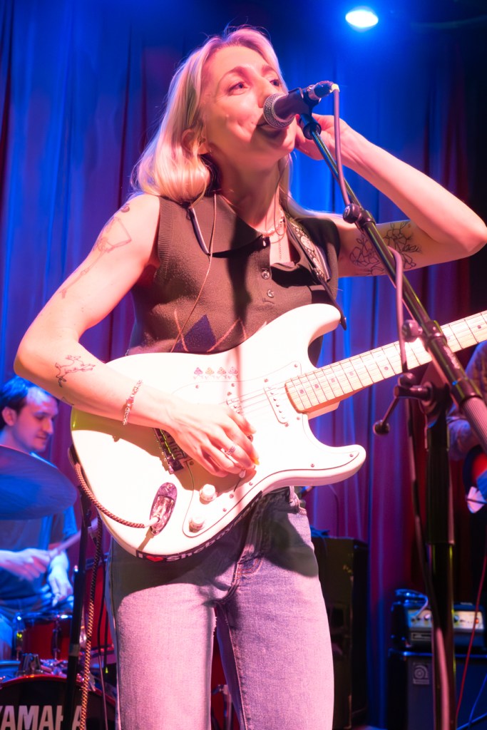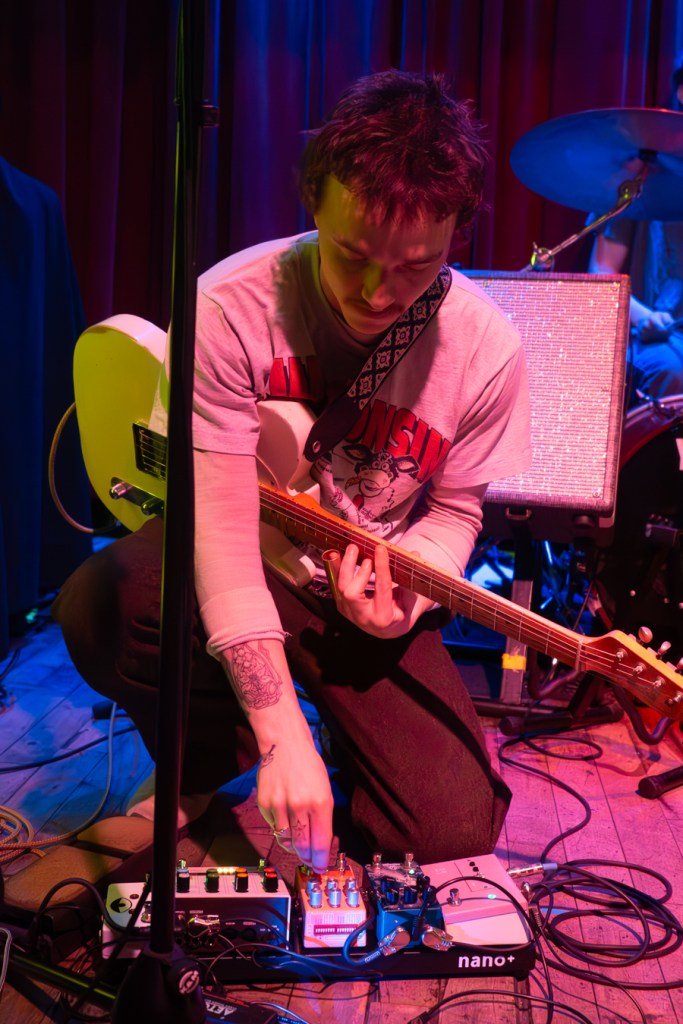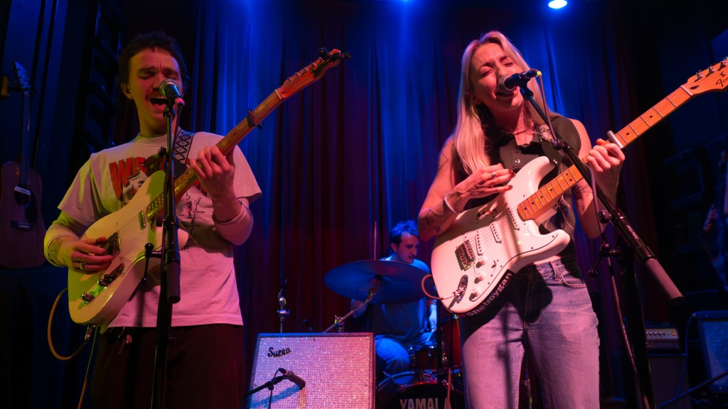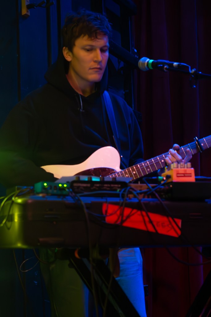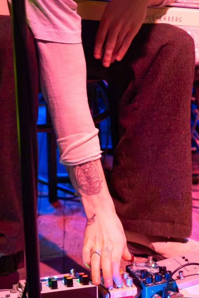 Union Pool was a fantastic choice for the show, as it set a cozy and relaxed environment for the evening. After doors opened at 7pm, audience members slowly streamed into the performance room with drinks and merch in hand. Sofia went on first and played an acoustic set; the audience respectfully swayed and cheered during and after each song. In contrast, Work Wife brought a full band sound to the stage. This allowed for a seamless transition to Mini Trees’s set, which featured a mix of both quieter and more upbeat songs.