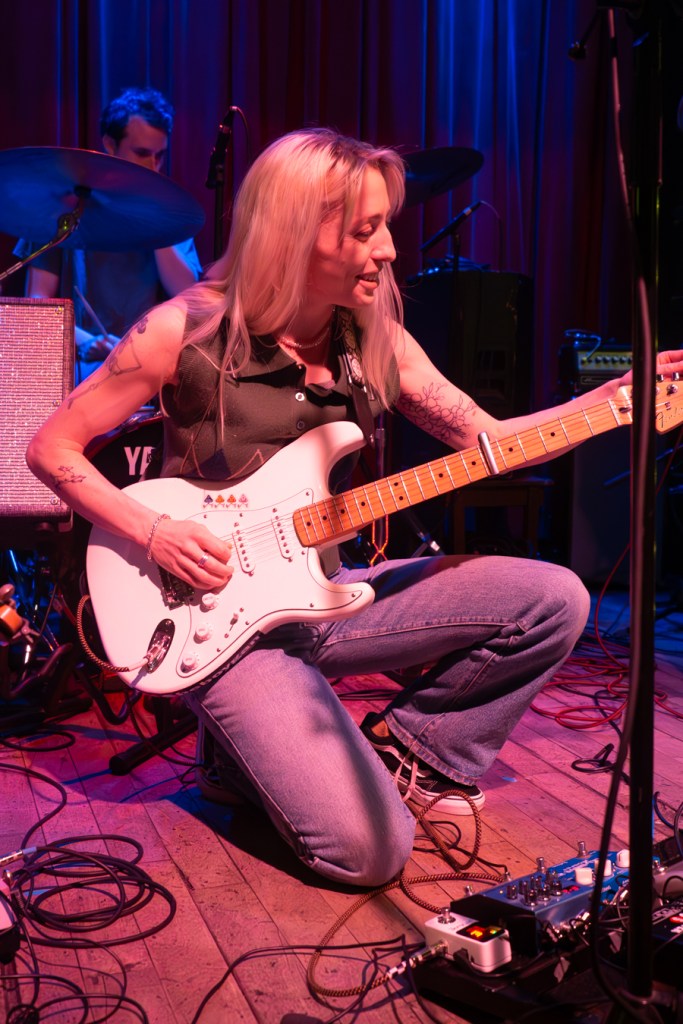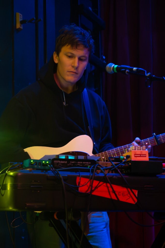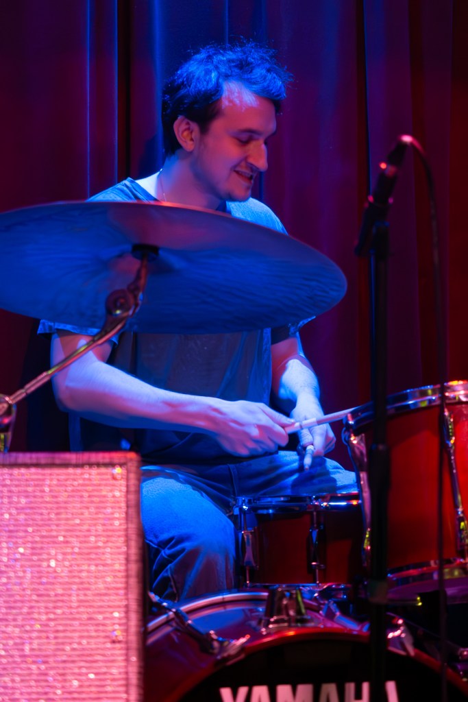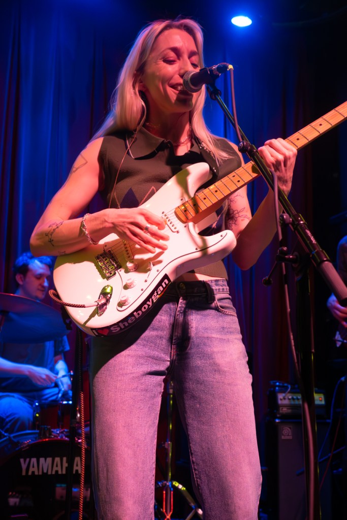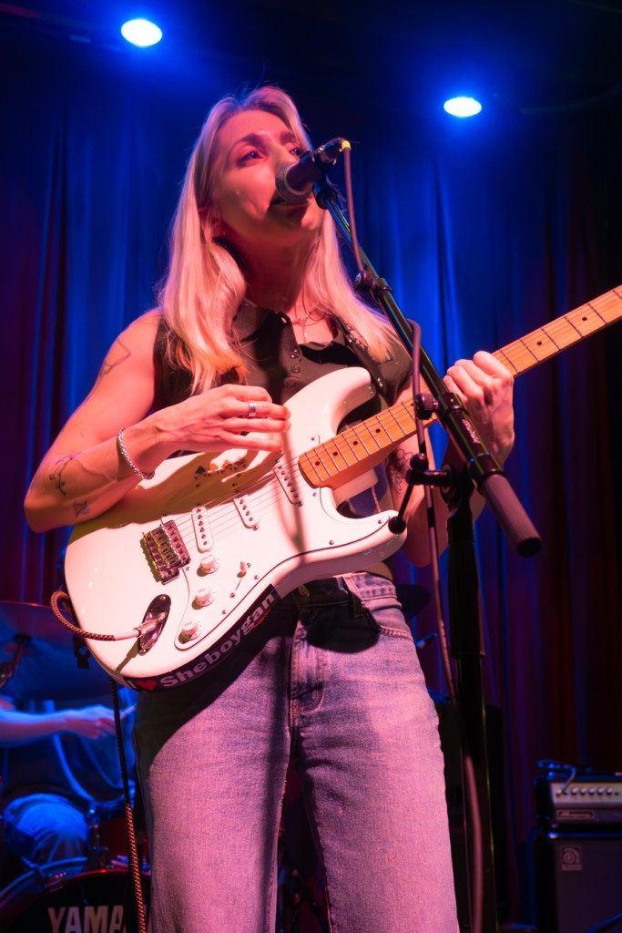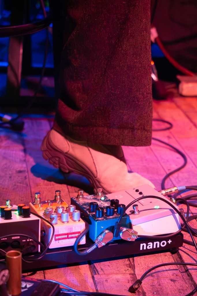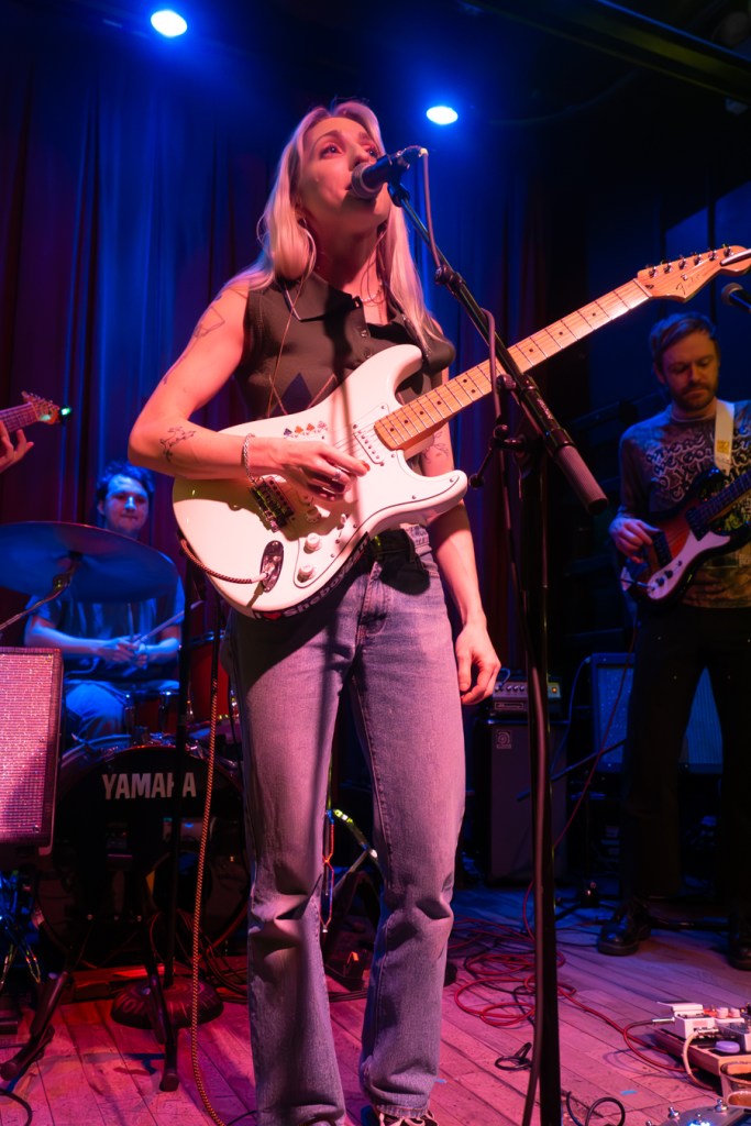 Union Pool was a fantastic choice for the show, as it set a cozy and relaxed environment for the evening. After doors opened at 7pm, audience members slowly streamed into the performance room with drinks and merch in hand. Sofia went on first and played an acoustic set; the audience respectfully swayed and cheered during and after each song. In contrast, Work Wife brought a full band sound to the stage. This allowed for a seamless transition to Mini Trees’s set, which featured a mix of both quieter and more upbeat songs.