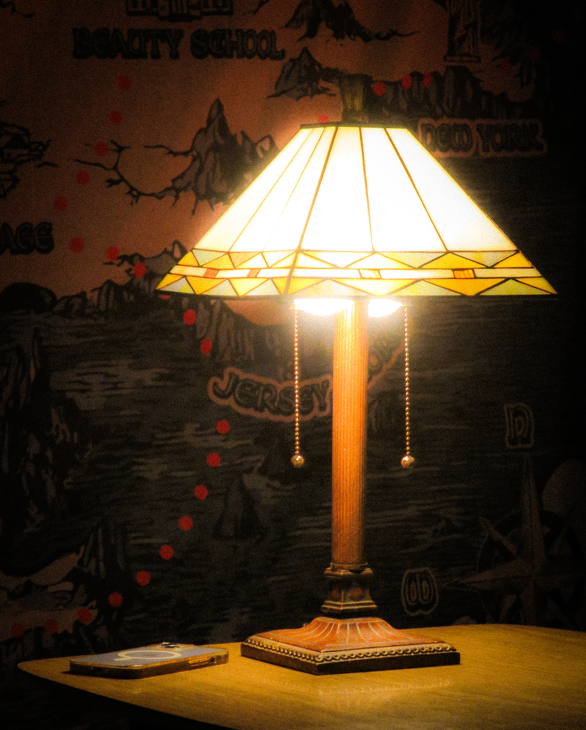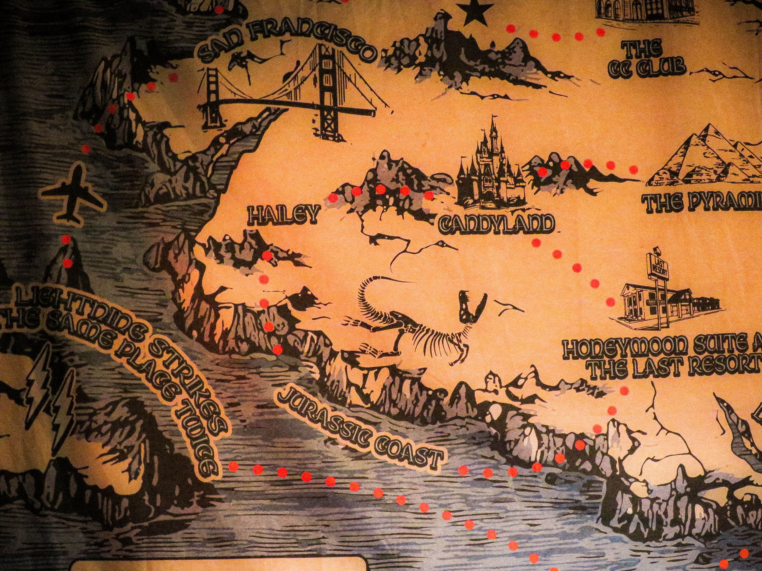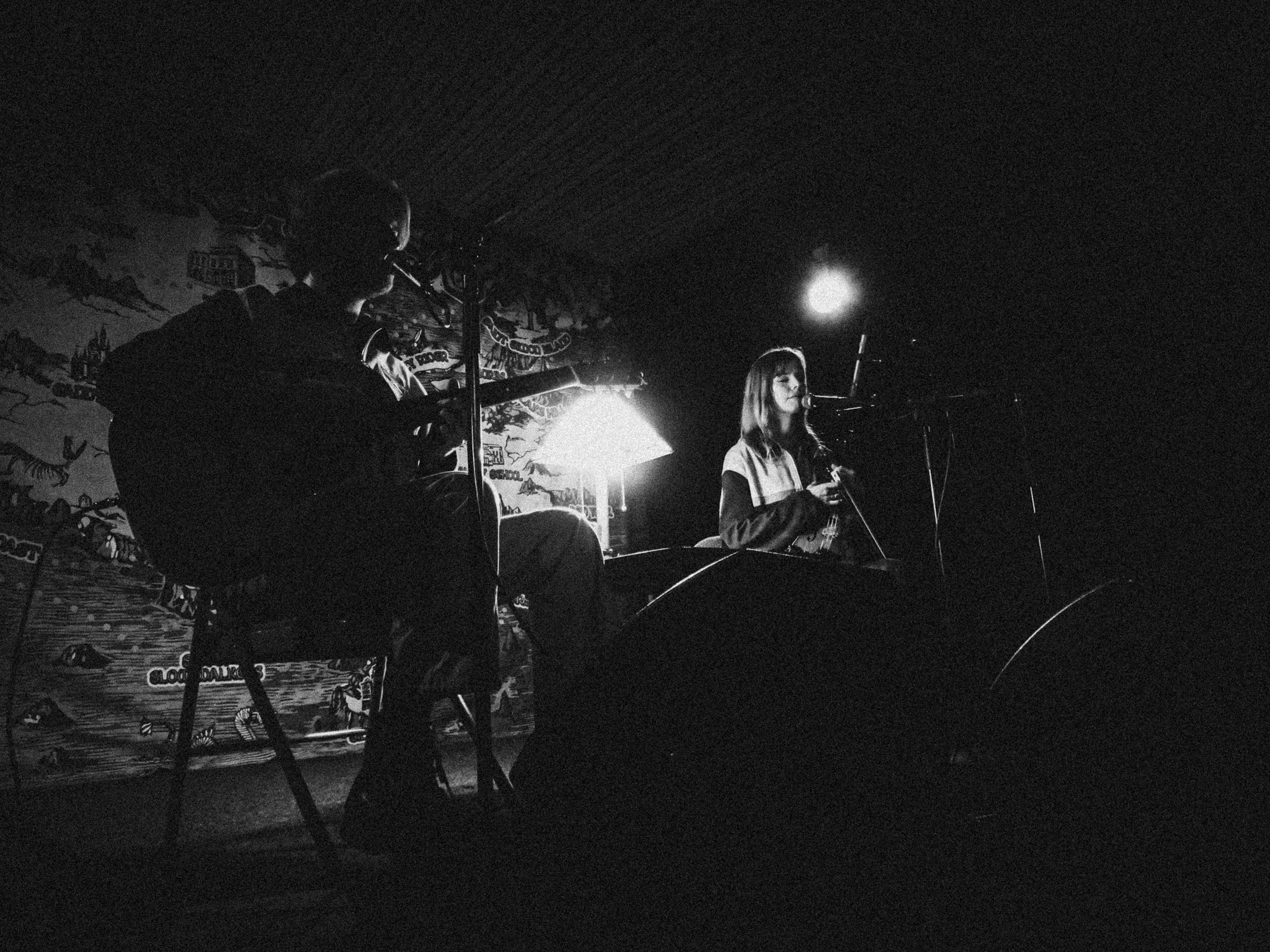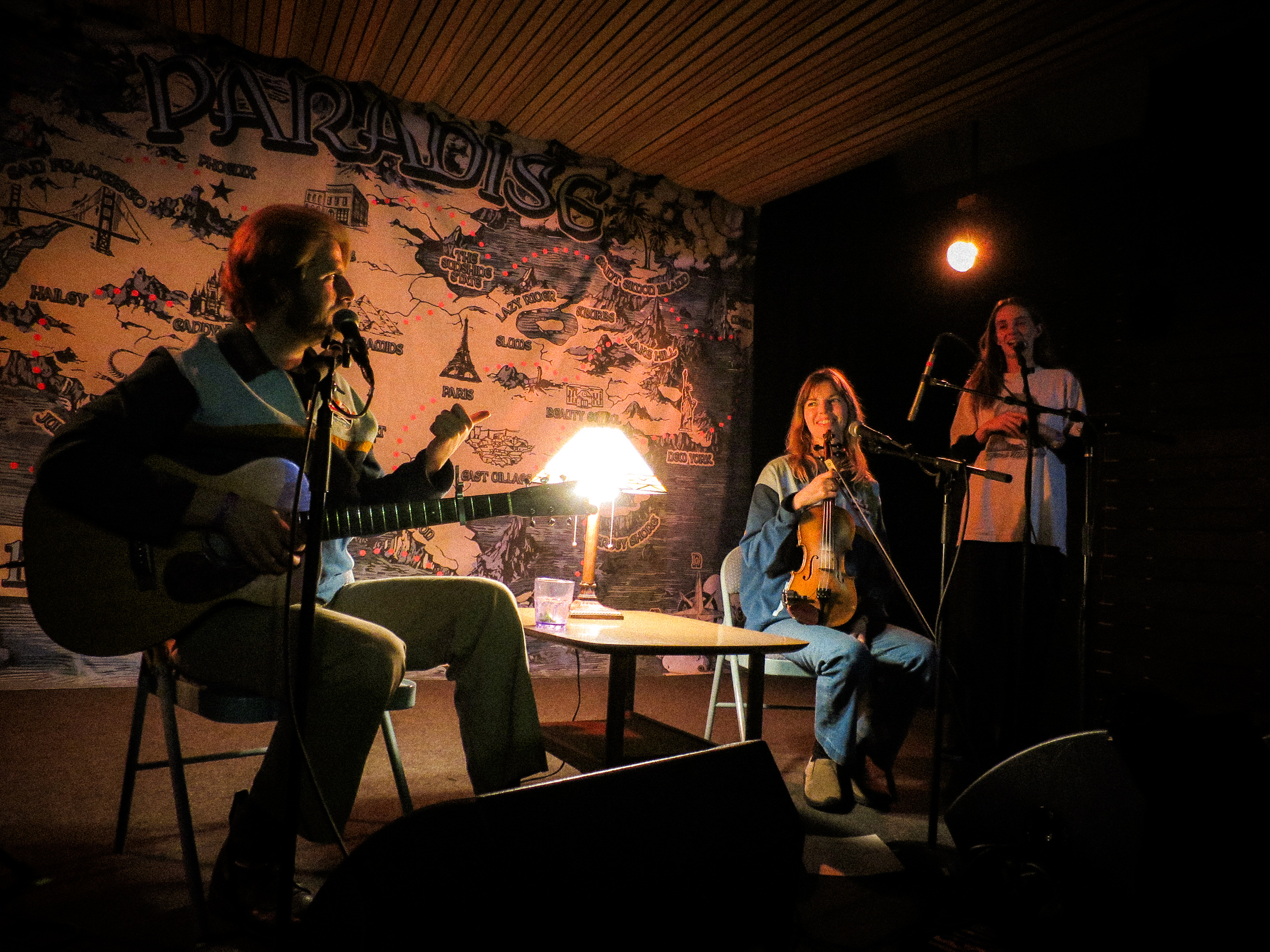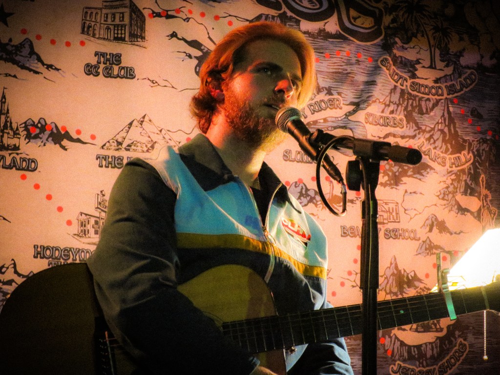 Christian Lee Hutson took to the stage at 9pm along with violinist and singer Odessa Jorgensen. They sported colorful matching jackets with “CLH” embroidered on the front. The intimate stage was set with a small table displaying a stained glass lamp. A large fantastical map of the United States with lyrical references to Hutson’s latest album provided a backdrop, and a cute way to keep the audience immersed, looking for easter eggs throughout the night.