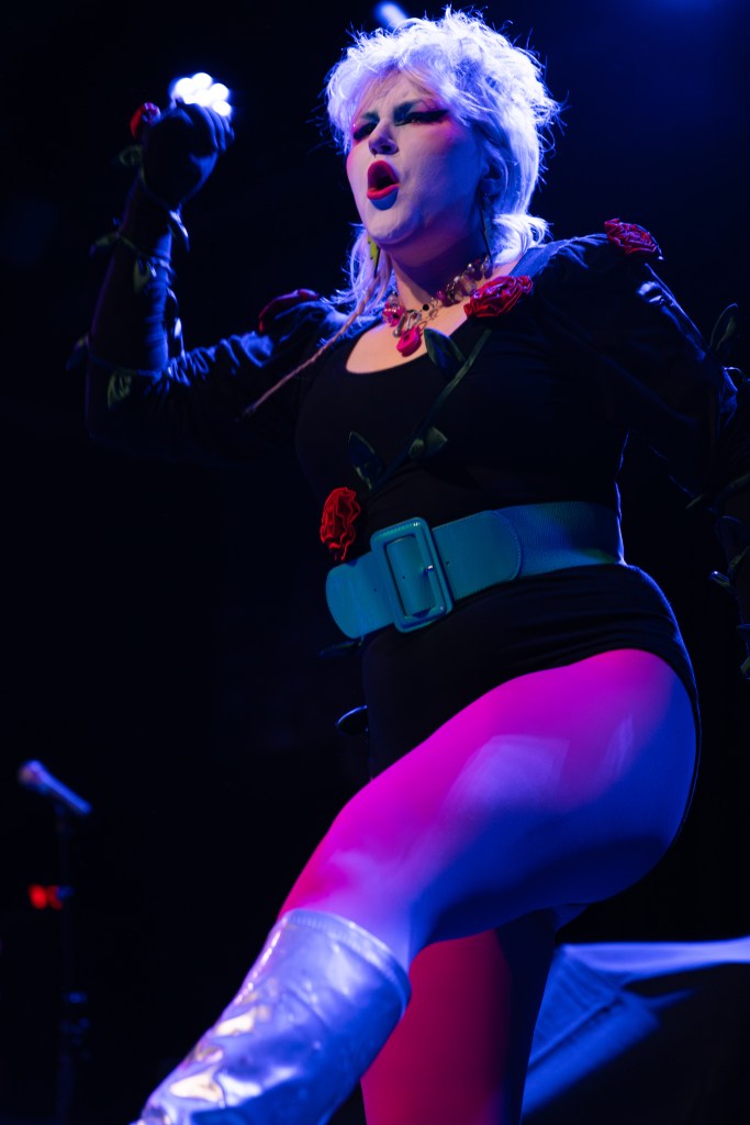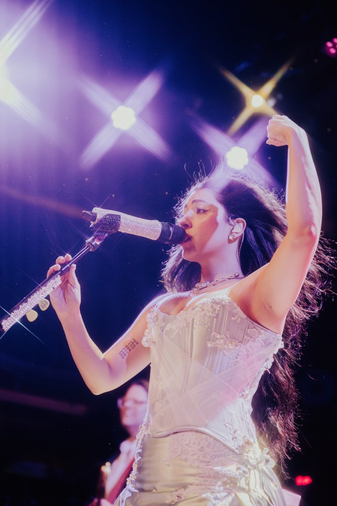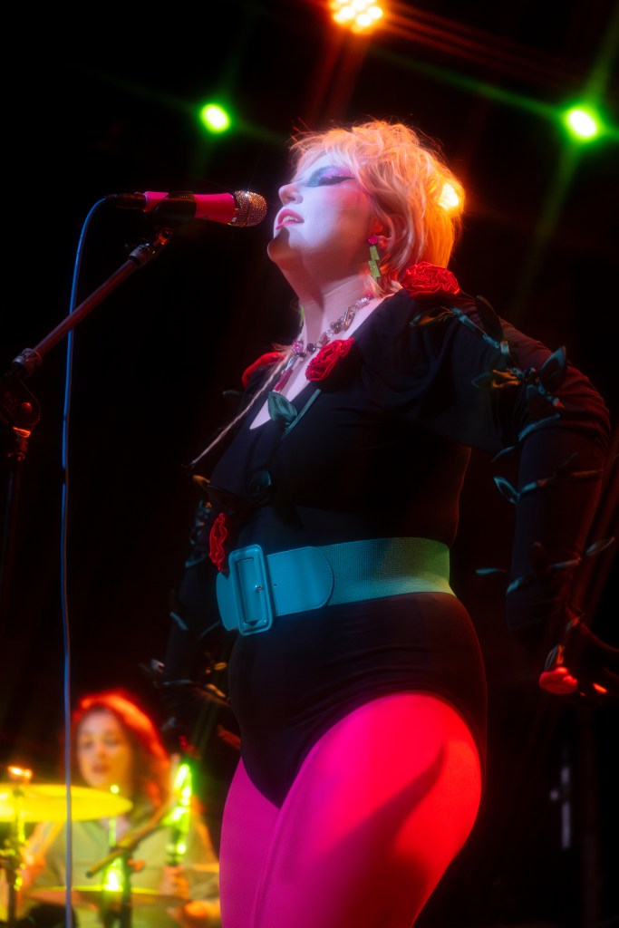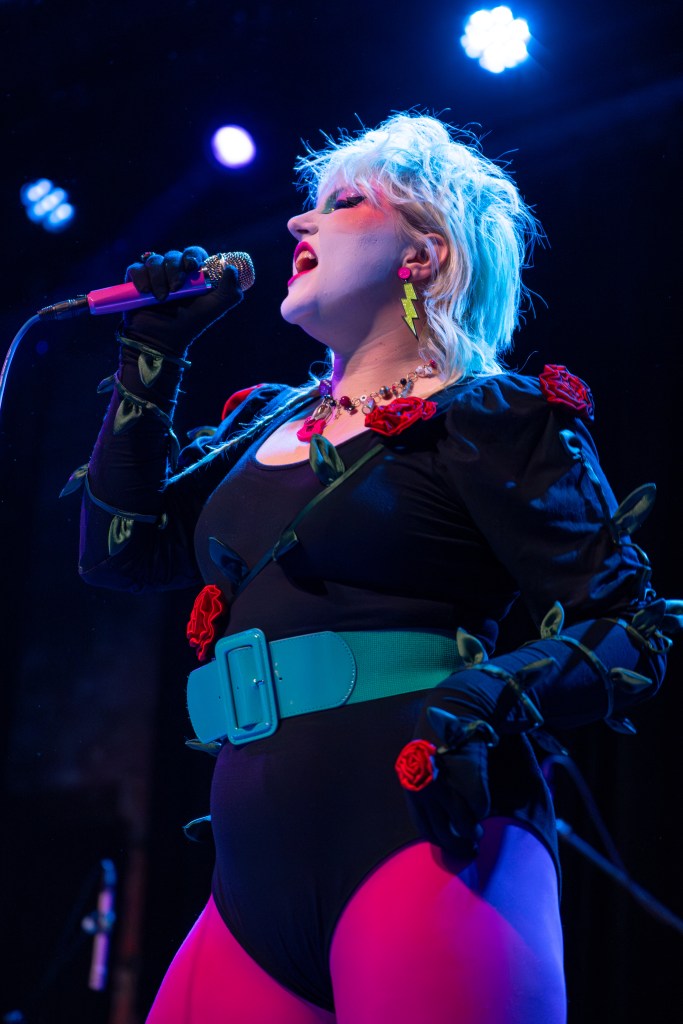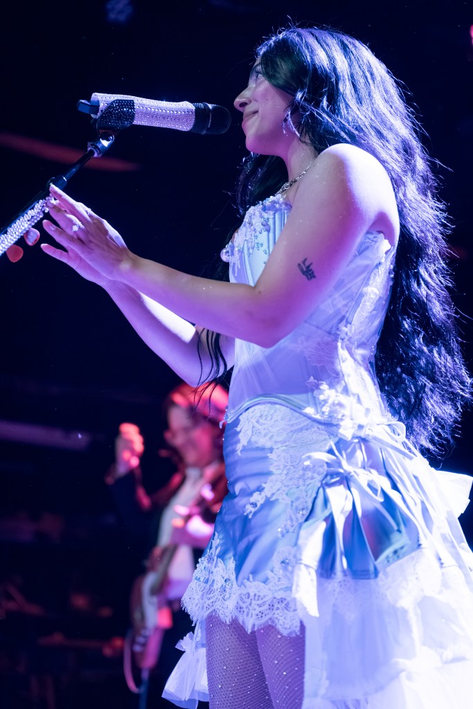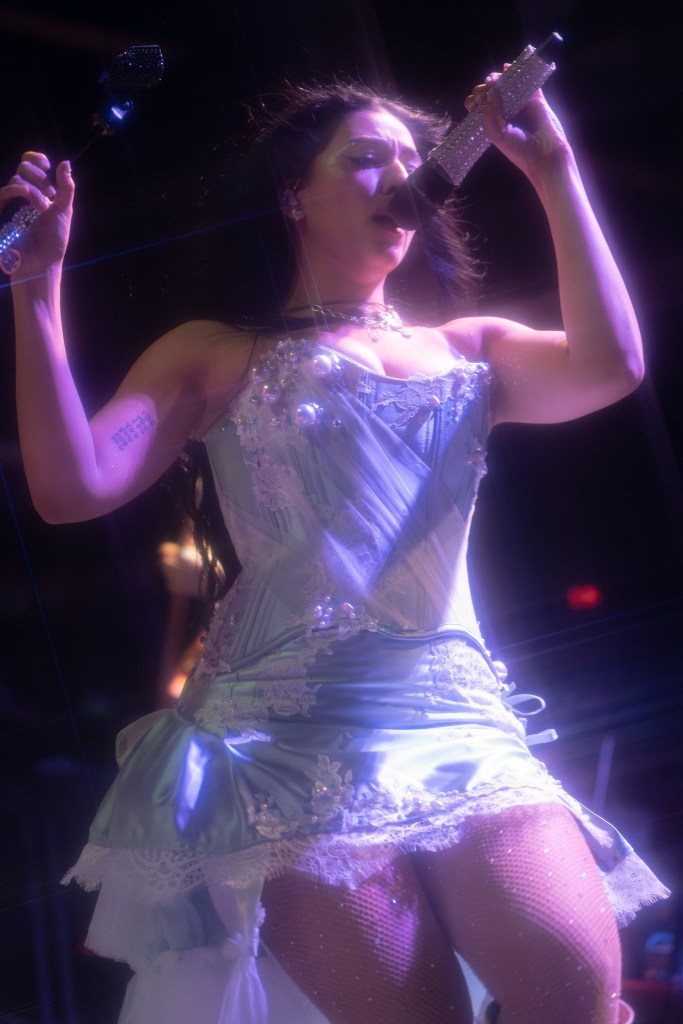 Pop artist Caroline Kingsbury opened the night and delivered a high energy, absolutely unforgettable performance. Caroline has a unique and colorful aesthetic that blends seamlessly with her refreshingly honest discography, which pulls sonic influences from musical legends such as Bruch Springsteen and The Killers. Caroline is rising to prominence due to her song “Kissing Someone Else,” an upbeat highlight off her debut album, Heaven’s Just A Flight. Most recently, she collaborated with fellow queer artist MARIS on the infectiously catchy indie pop single, “Give Me A Sign.” Caroline was extremely engaging on stage, taking the time to interact with fans in the crowd and even joining them in the pit for the final song of her set. I stopped by Caroline’s merch table after her performance and she took the time to speak with me about her experience on the tour. I also shared how much I love both “Give Me A Sign” and her most recent solo EP, I Really Don’t Care! It’s clear from our conversation, as well as her opening set on The Mirrorball Tour, that Caroline is an authentic and talented artist that everyone should have on their radar.