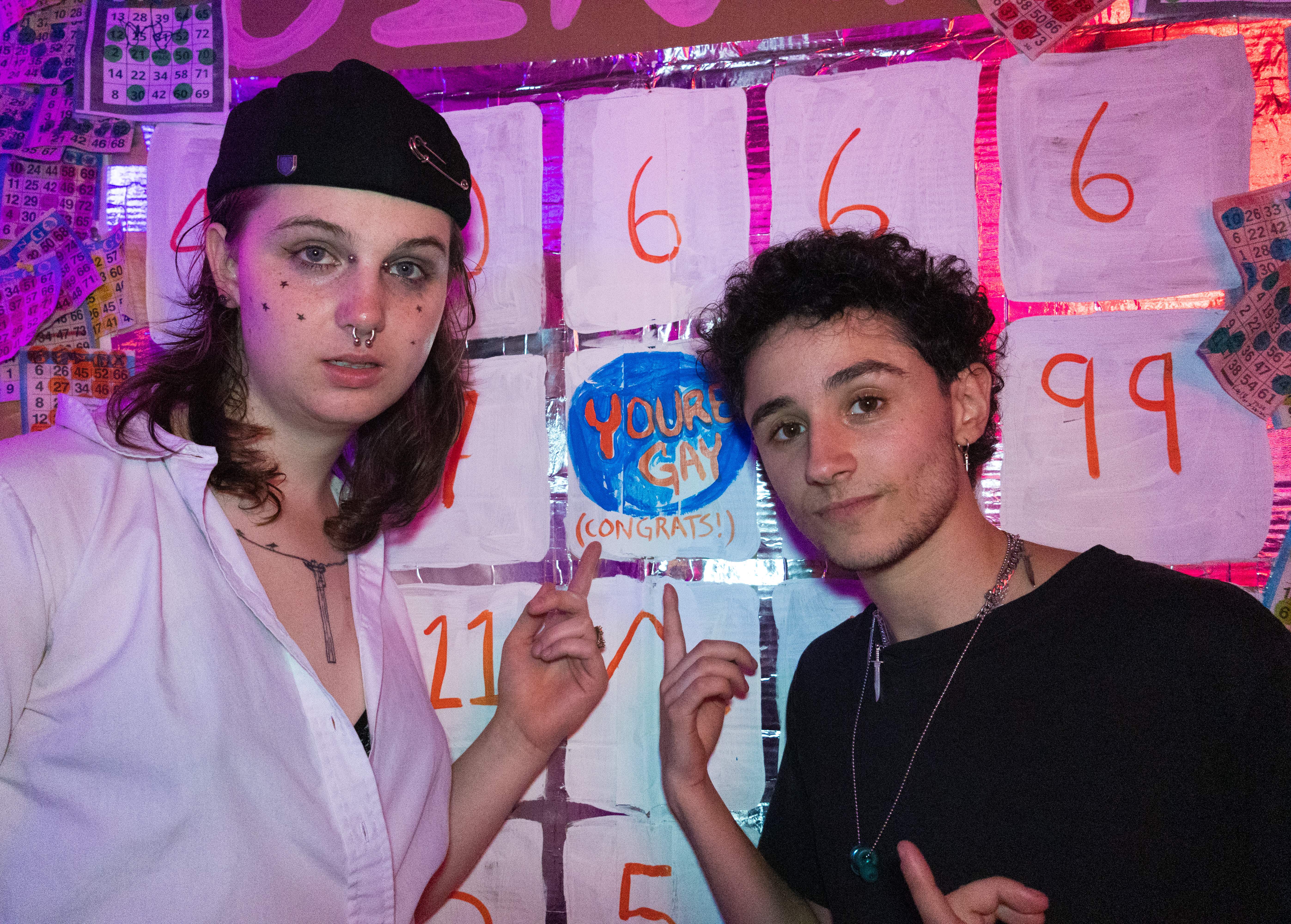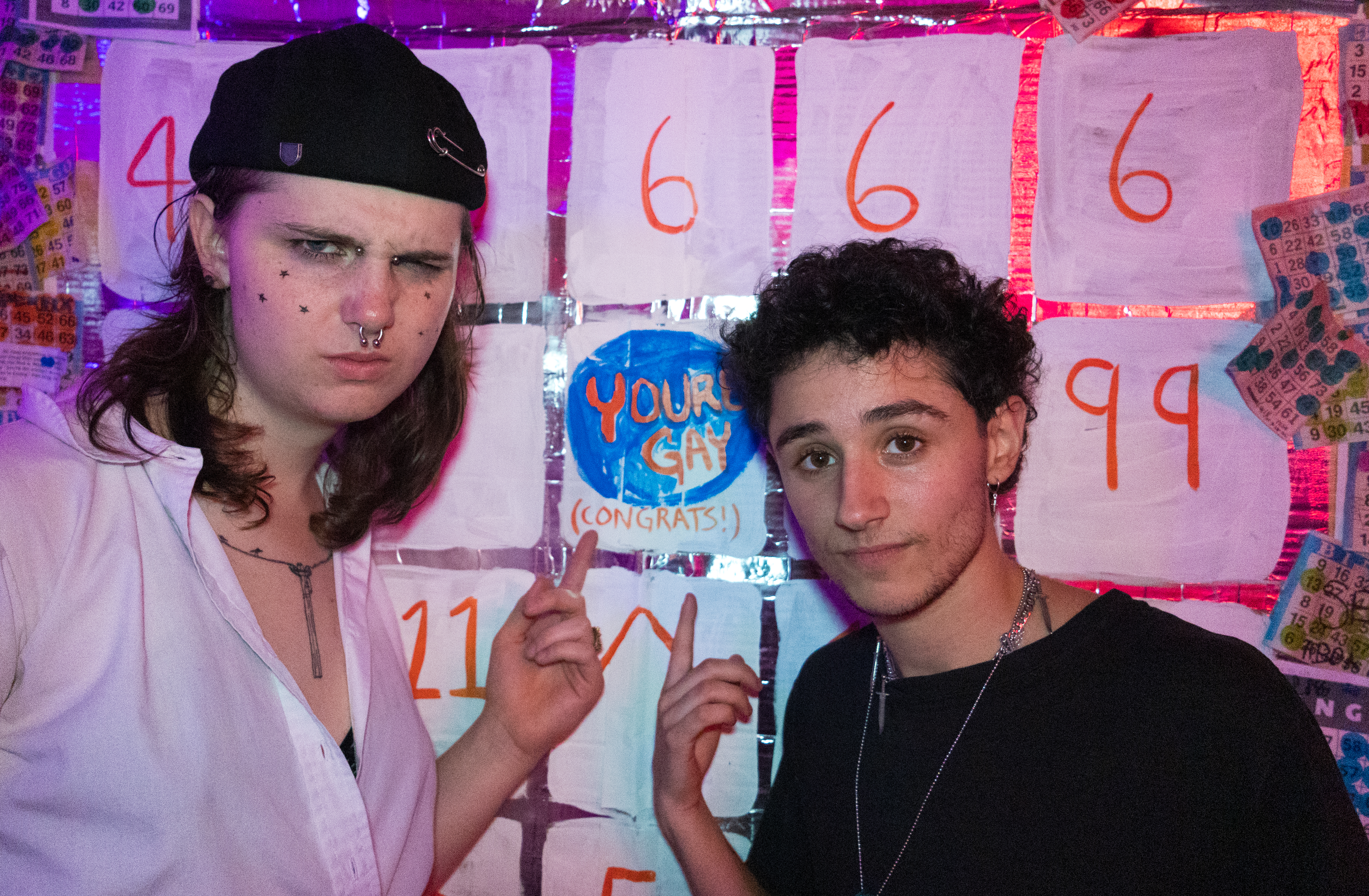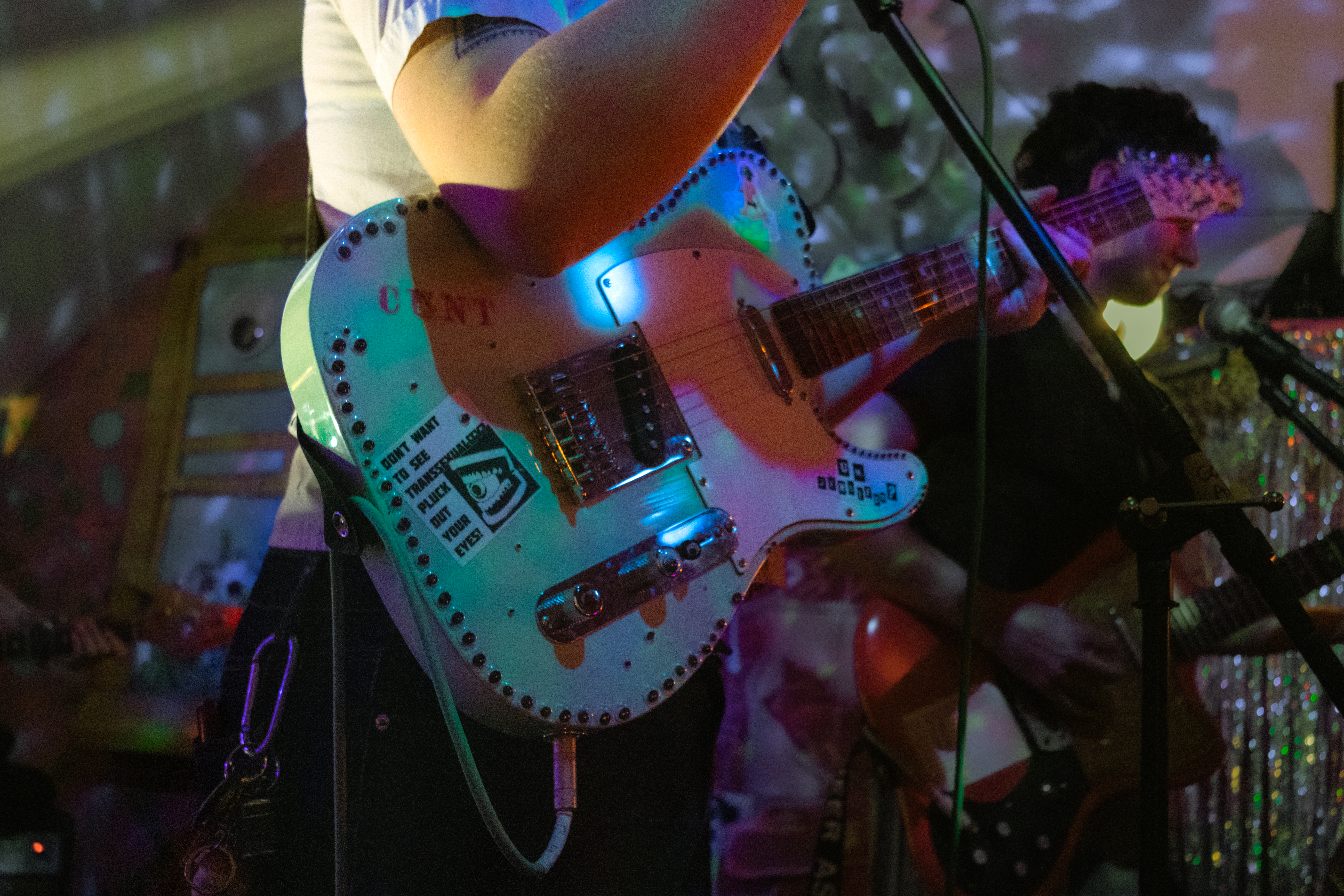 When people ask me about Um, Jennifer?, I always say they describe themselves with the catchphrase “trans slut rock” far better than I could describe them. On Friday, the duo embodied this phrase while opening for Deadbeat Girl in Philadelphia at God’s Automatic Body. This DIY venue is filled with eccentric decor – pink stuffed monkeys, paper mache clouds, a bingo wall with the center square reading “You’re gay (congrats!)” – that looks like an Um, Jennifer? project come to life.