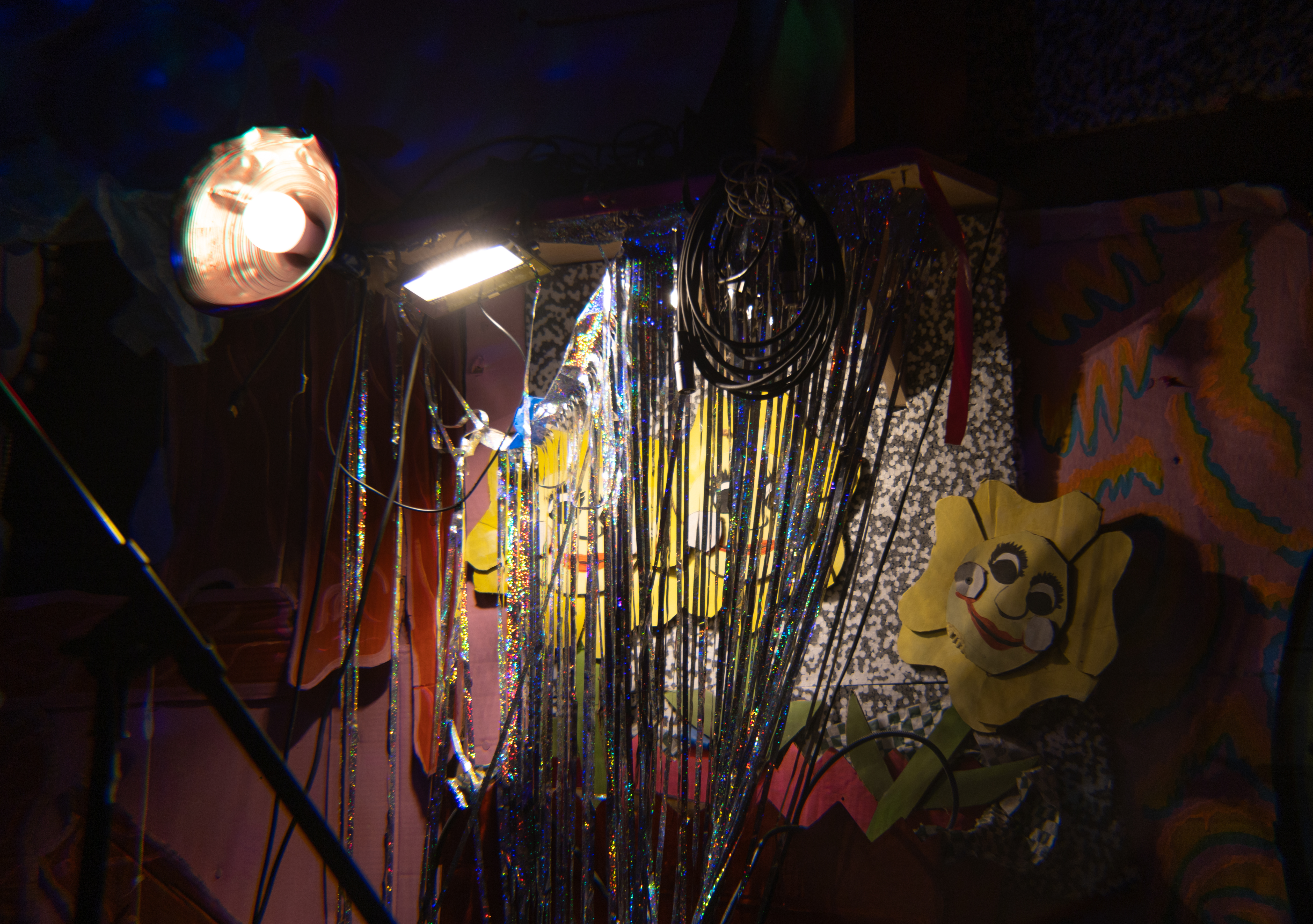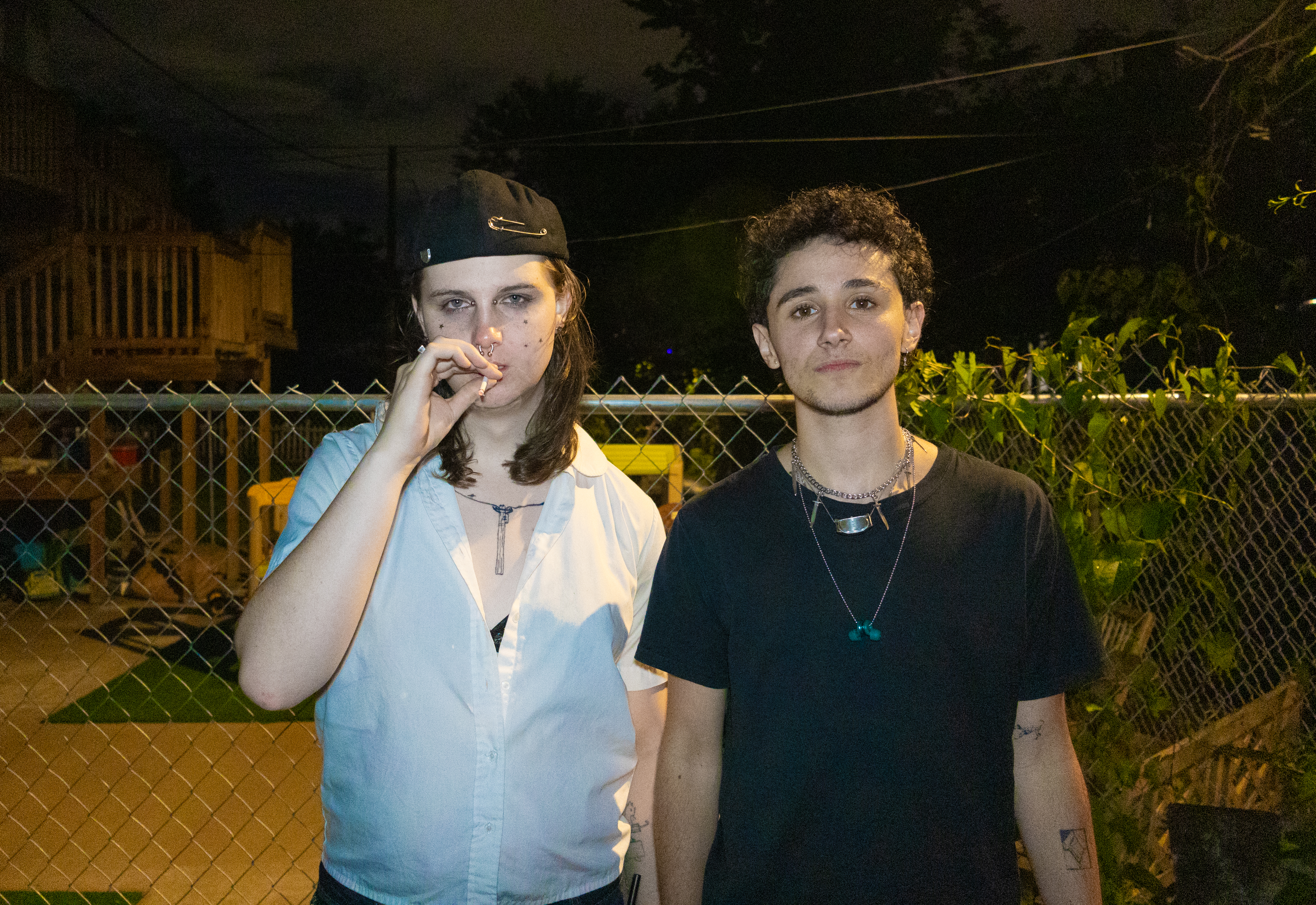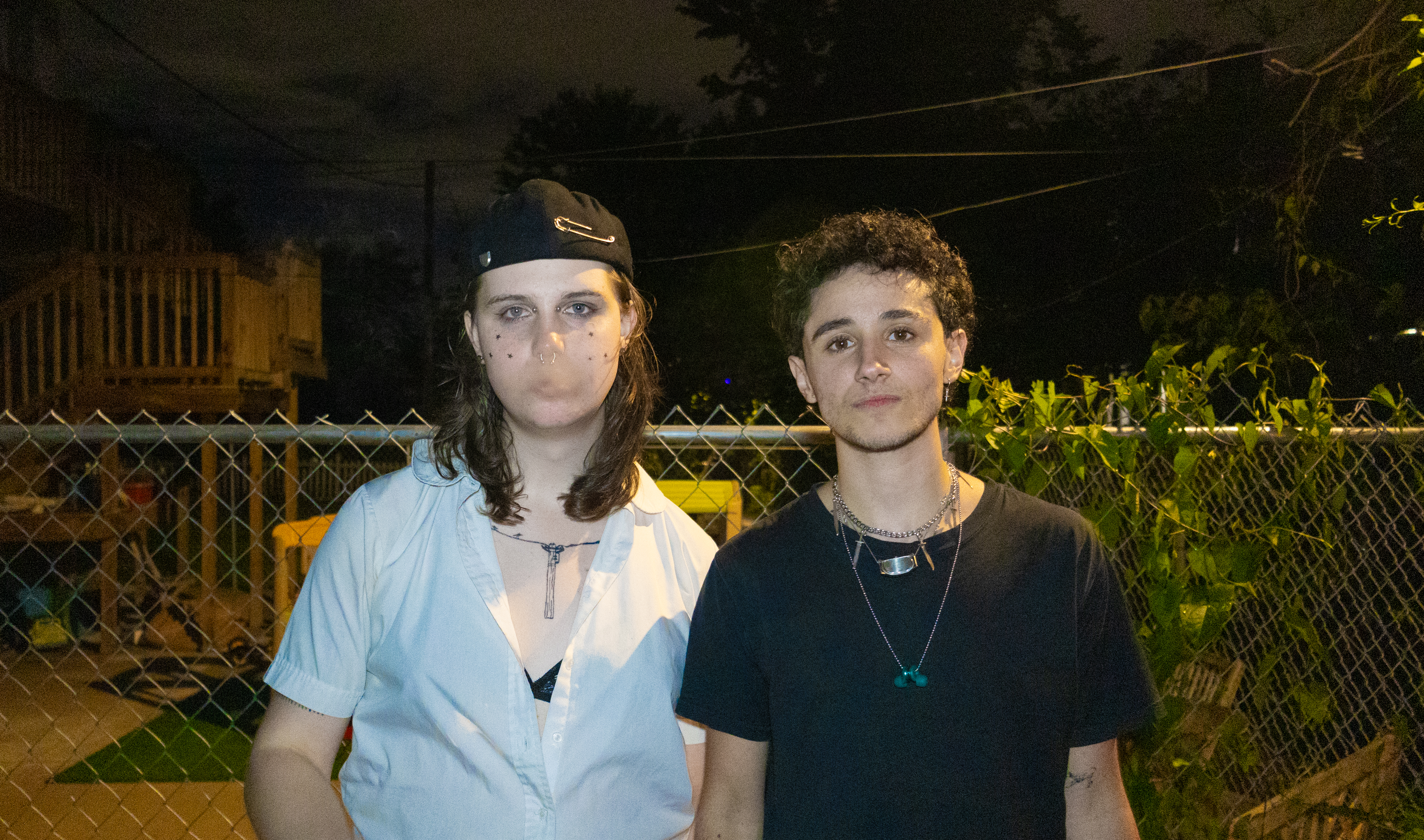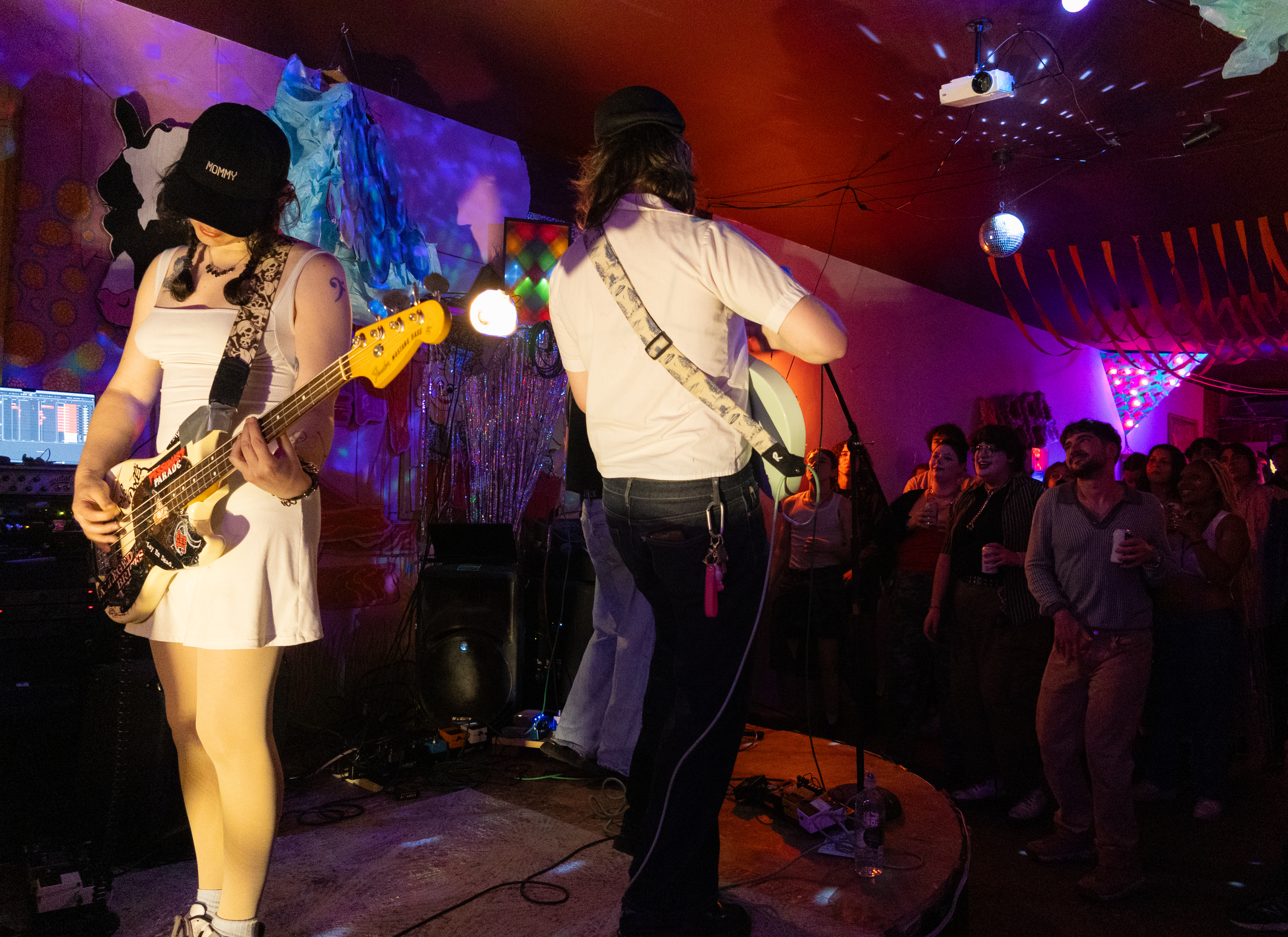 When people ask me about Um, Jennifer?, I always say they describe themselves with the catchphrase “trans slut rock” far better than I could describe them. On Friday, the duo embodied this phrase while opening for Deadbeat Girl in Philadelphia at God’s Automatic Body. This DIY venue is filled with eccentric decor – pink stuffed monkeys, paper mache clouds, a bingo wall with the center square reading “You’re gay (congrats!)” – that looks like an Um, Jennifer? project come to life.