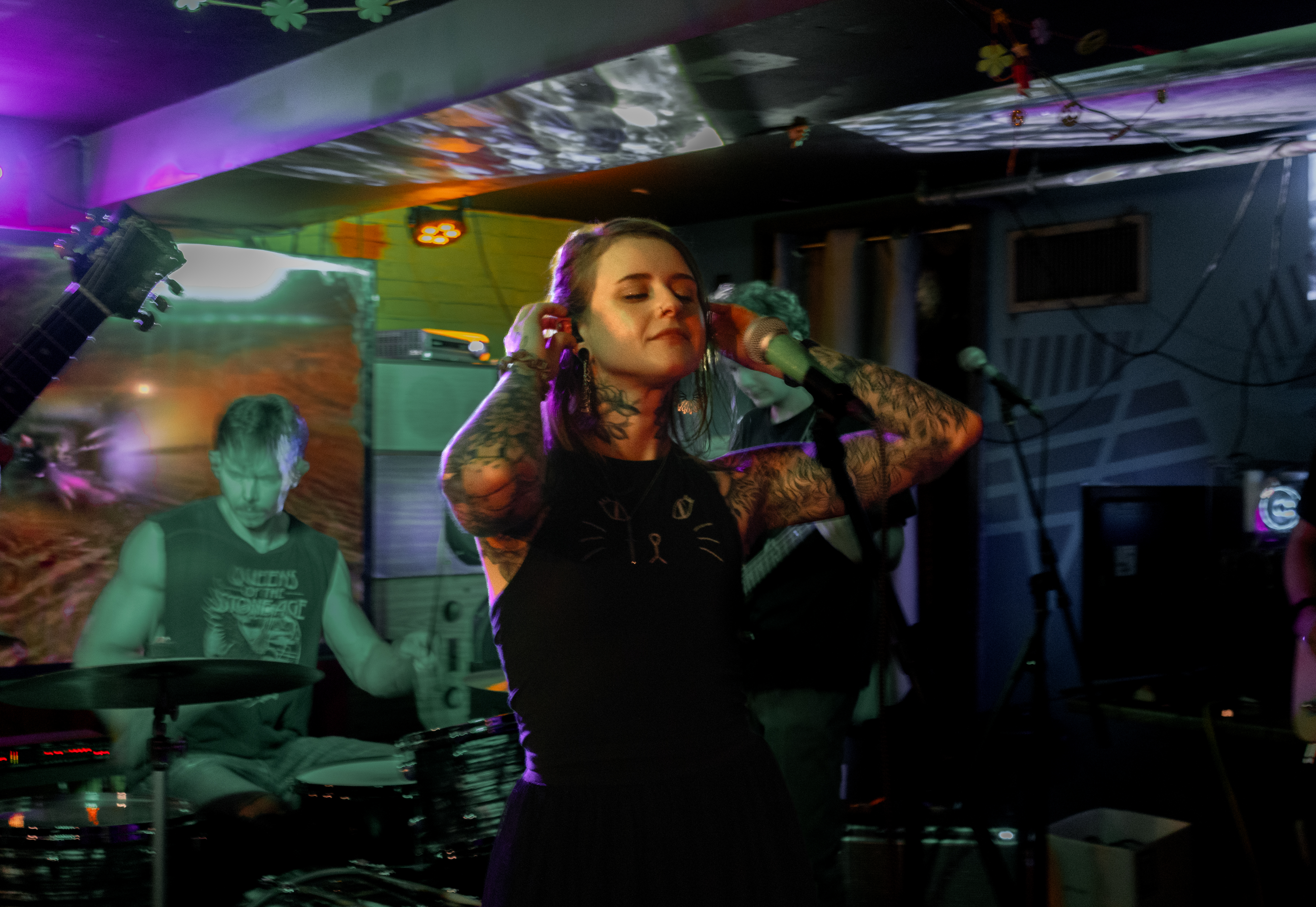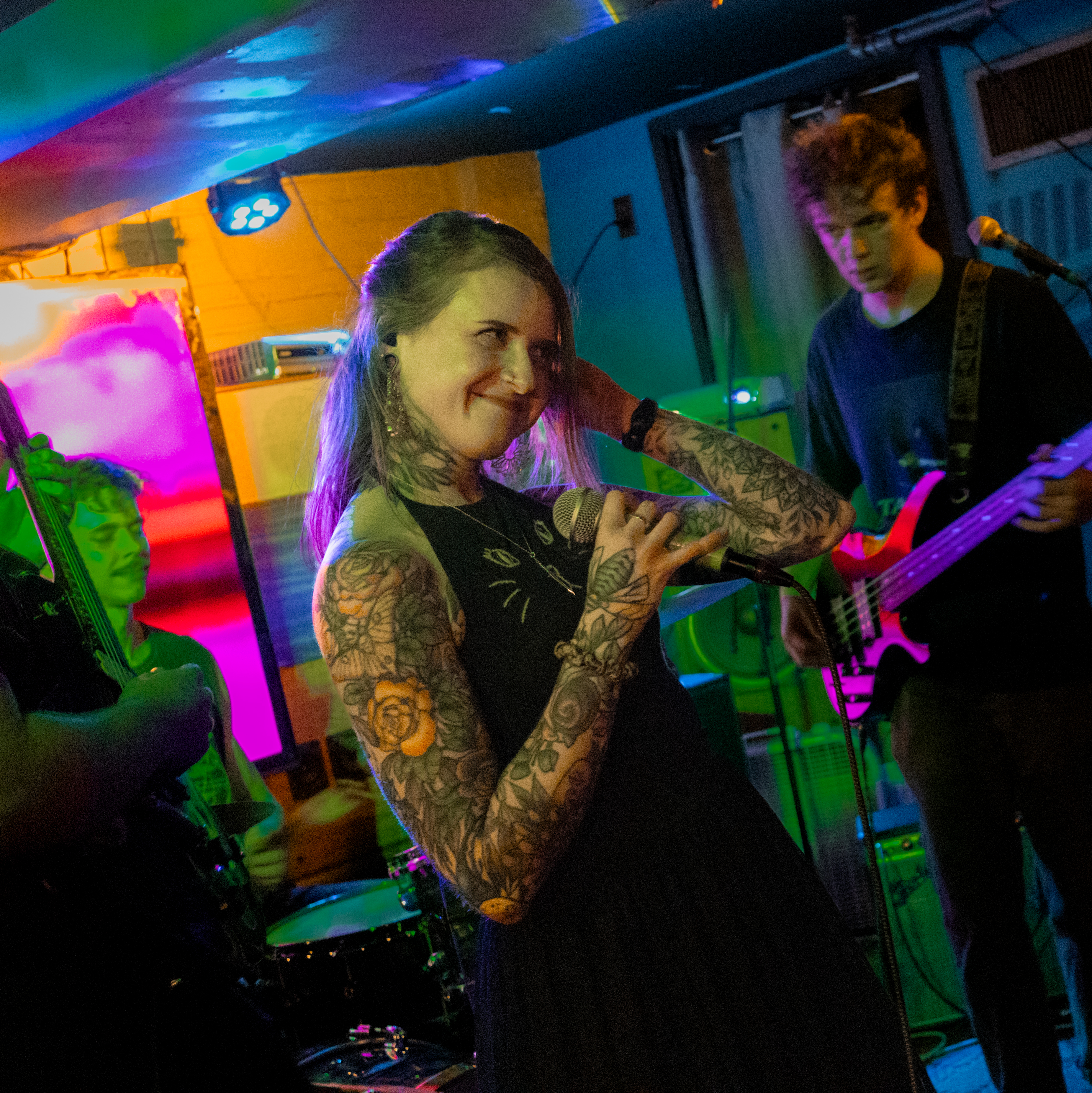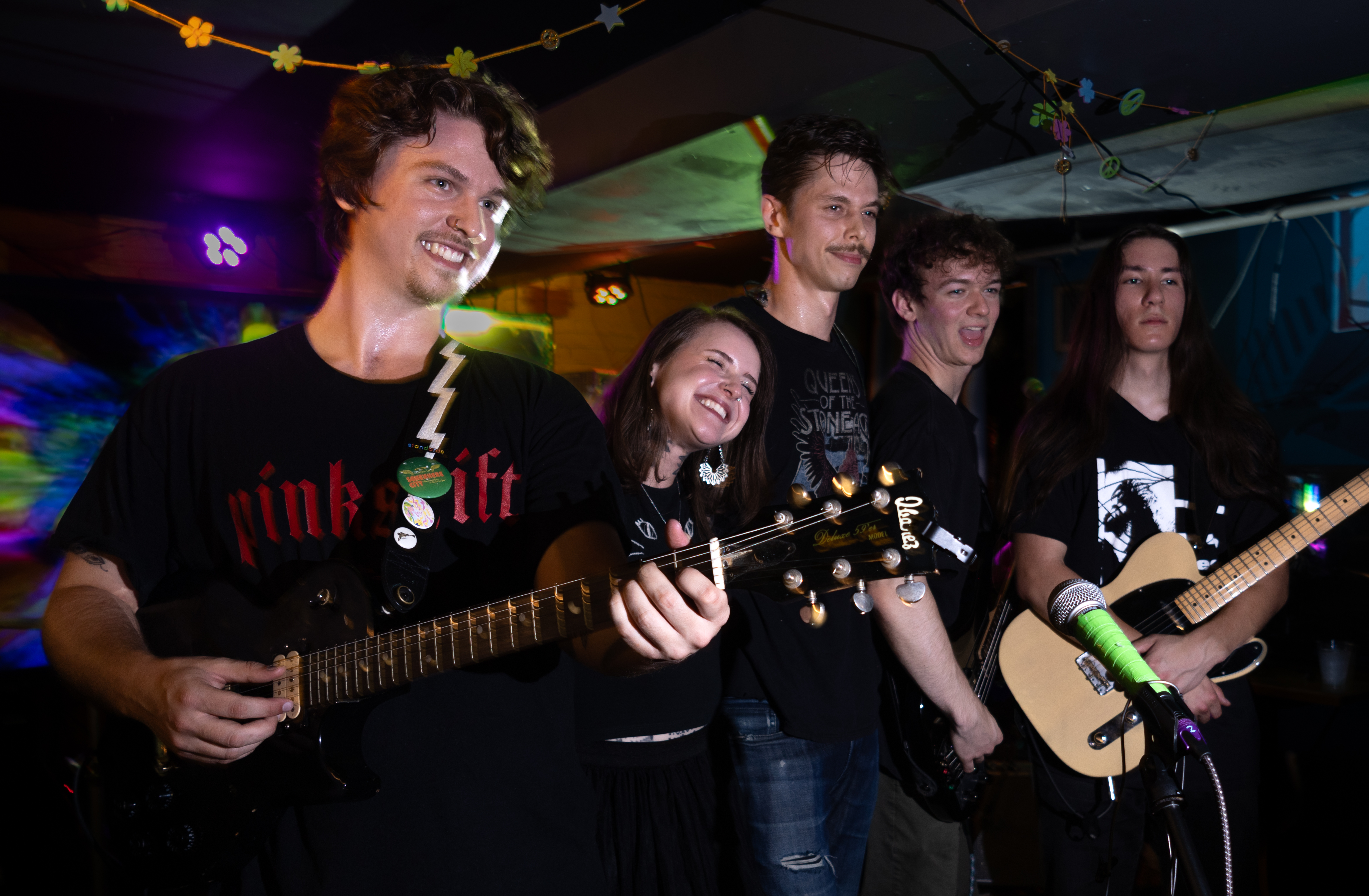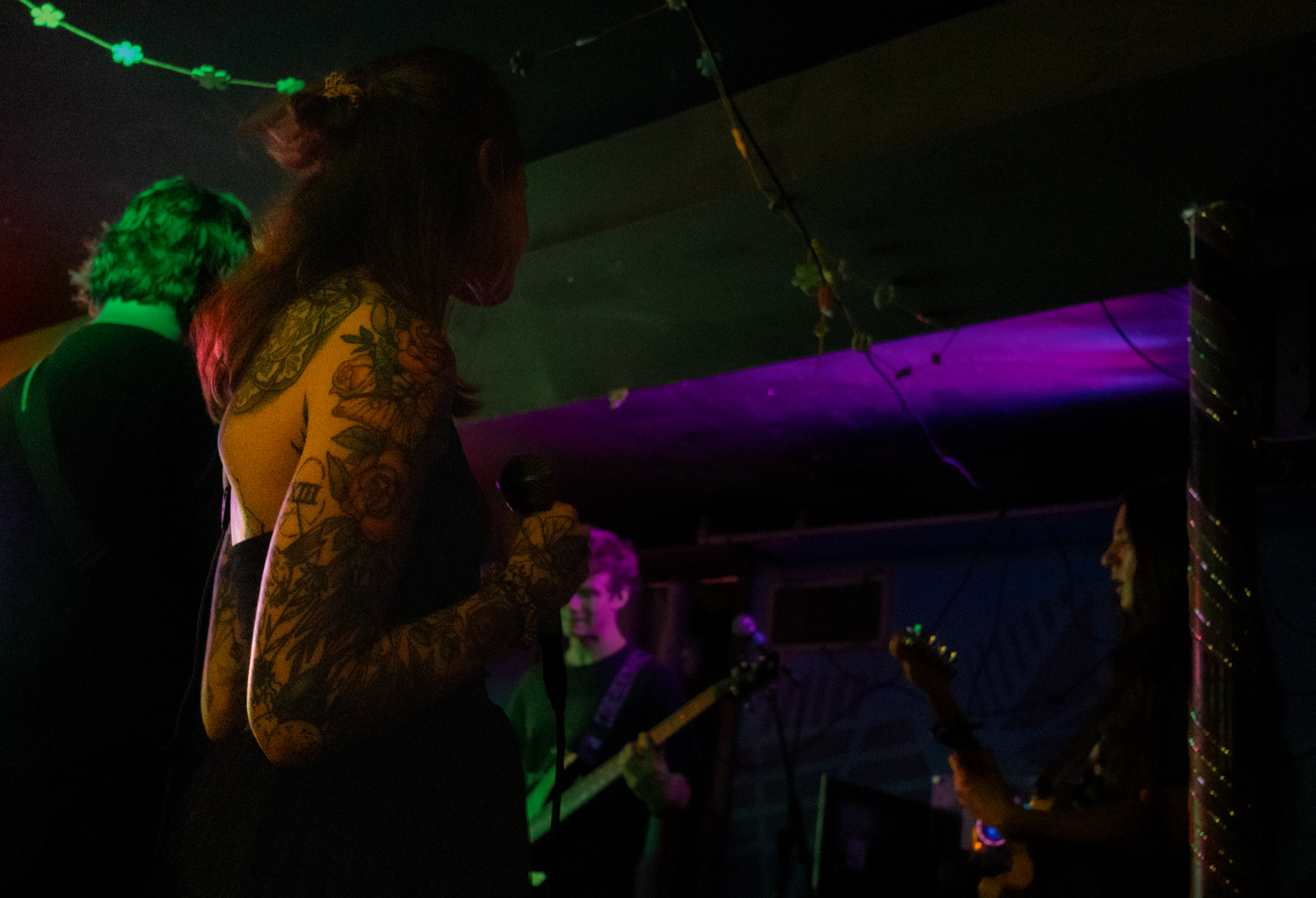 Math-rock band Love For Strangers celebrated the release of their EP “Gone Through Motions” with a short but sweet set Thursday night. They played at The Bassment, a venue tucked beneath Baltimore pizza shop Ema’s Corner. Guitarists Jefferson Hirshman and Nik Redcay, bassist Zach Miskimon, and drummer Jack Naden warmed up the audience with an instrumental song before singer Rachel Byer skipped up to the microphone stand.