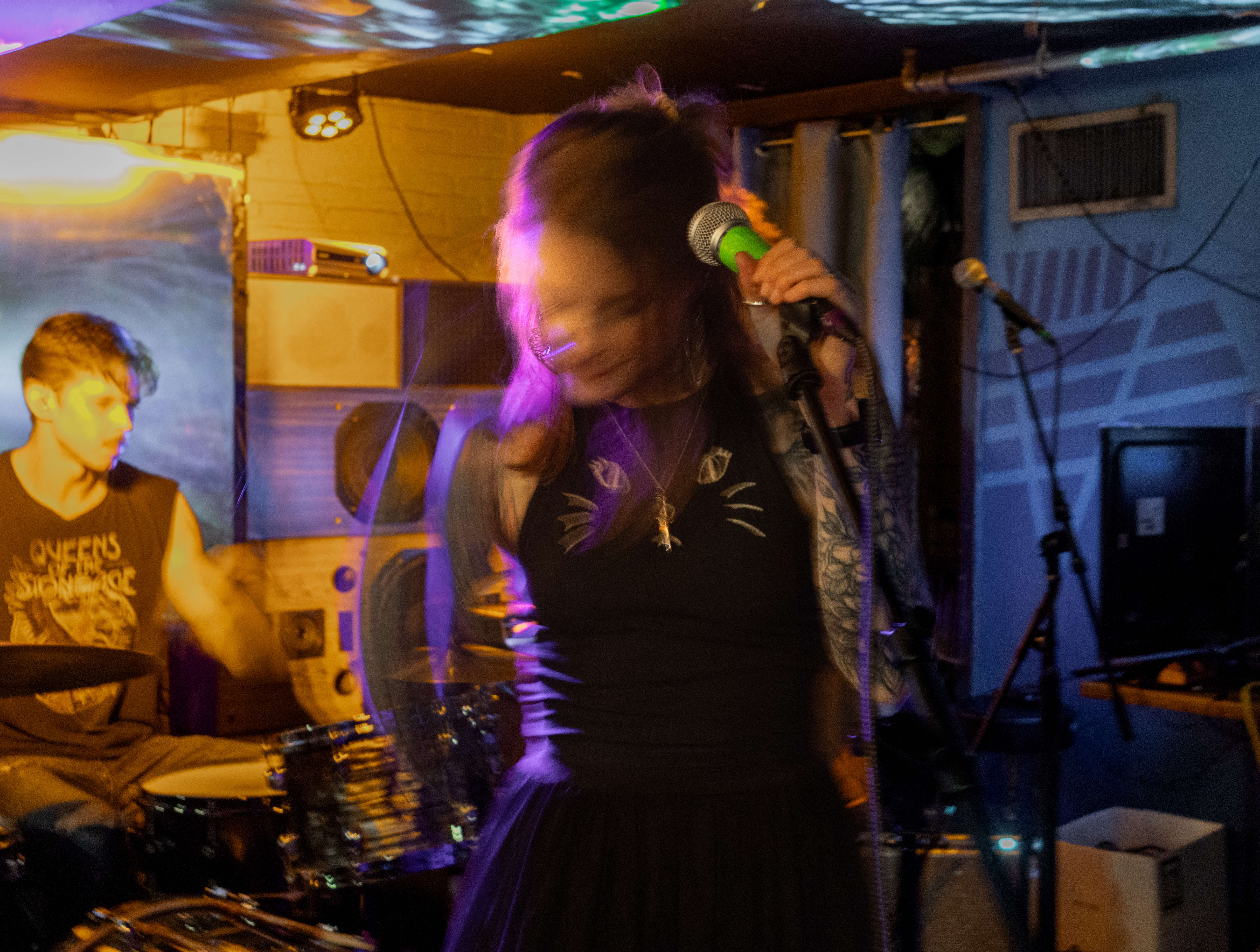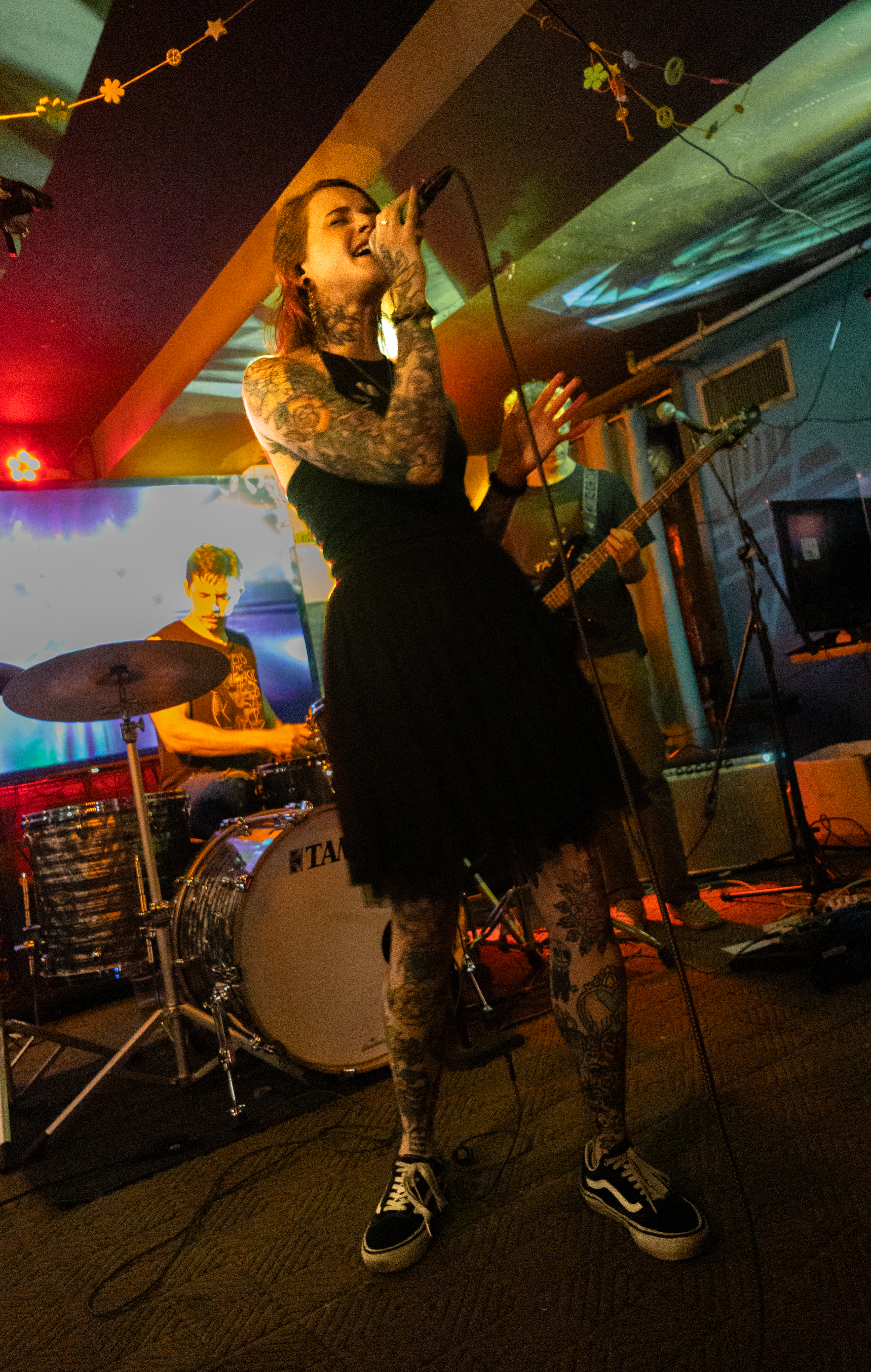 “Hi, friends!” Byer greeted the crowd, her inviting tone reminiscent of an elementary school teacher’s – though her tattoo-covered limbs and gauged ears gave her away as decidedly punk. She quickly moved her mic stand aside, keeping just her bright green microphone, to give herself more dancing room. Her black dress flounced as she jumped back and forth, directing the audience to follow her lead.