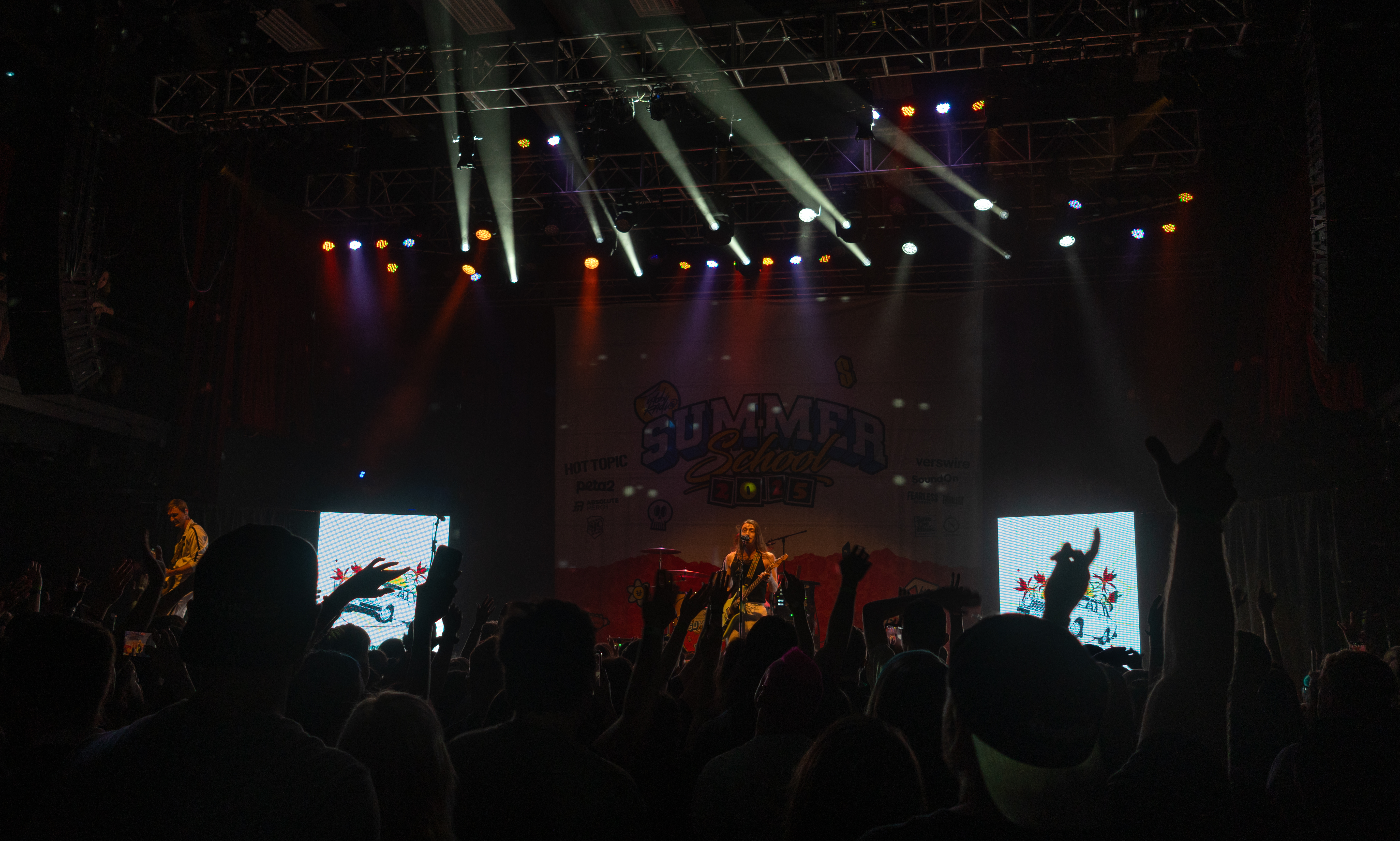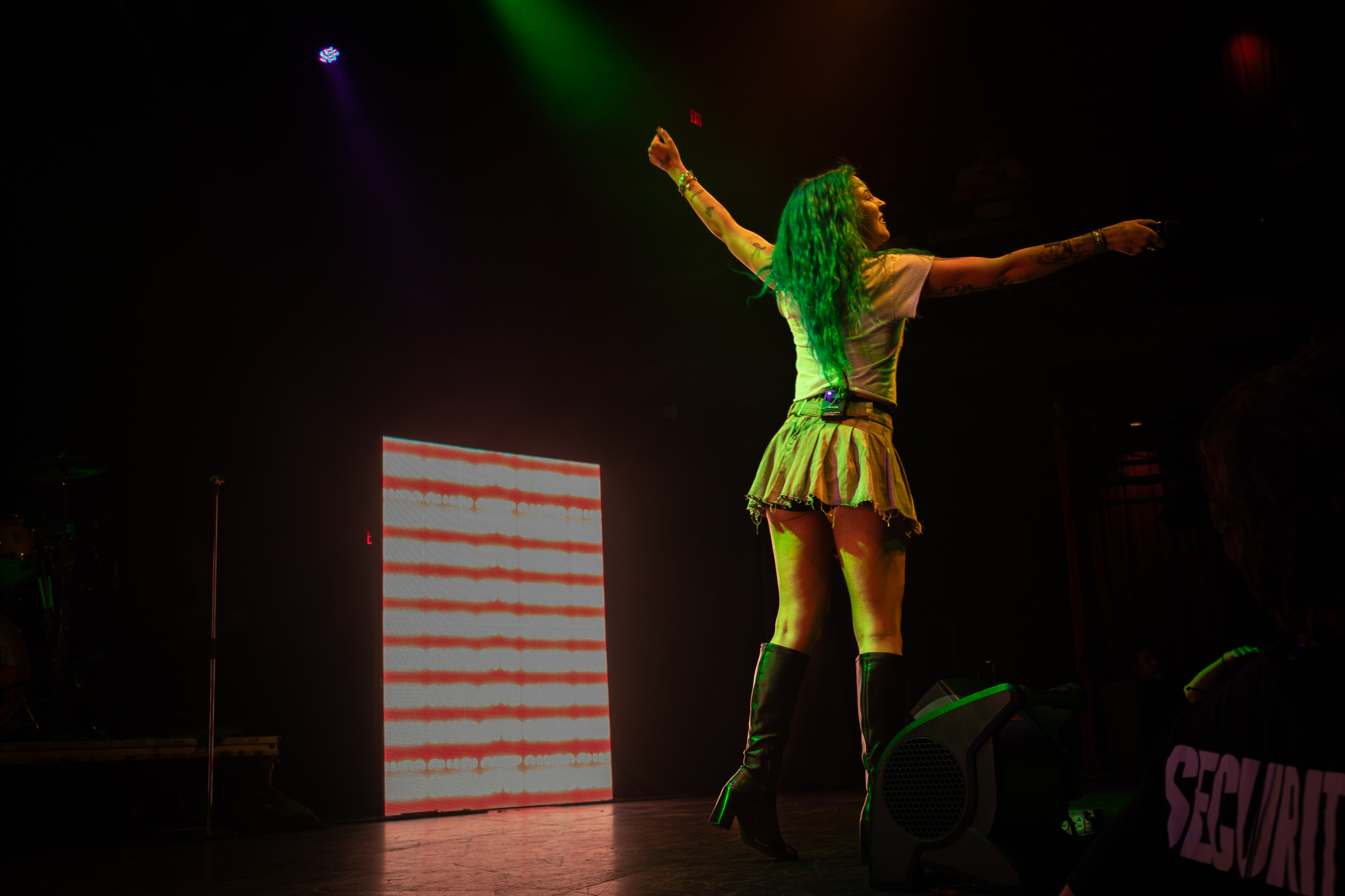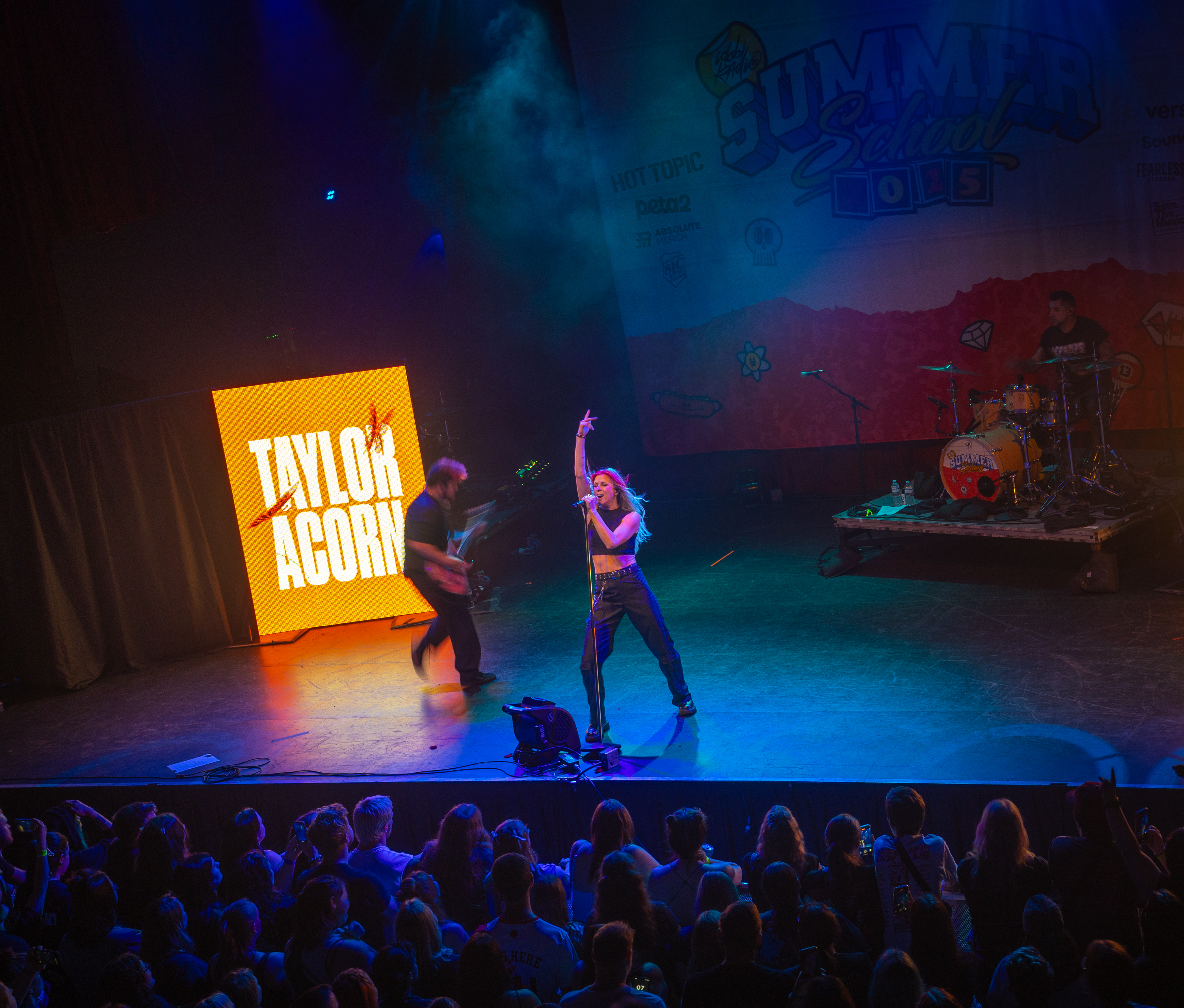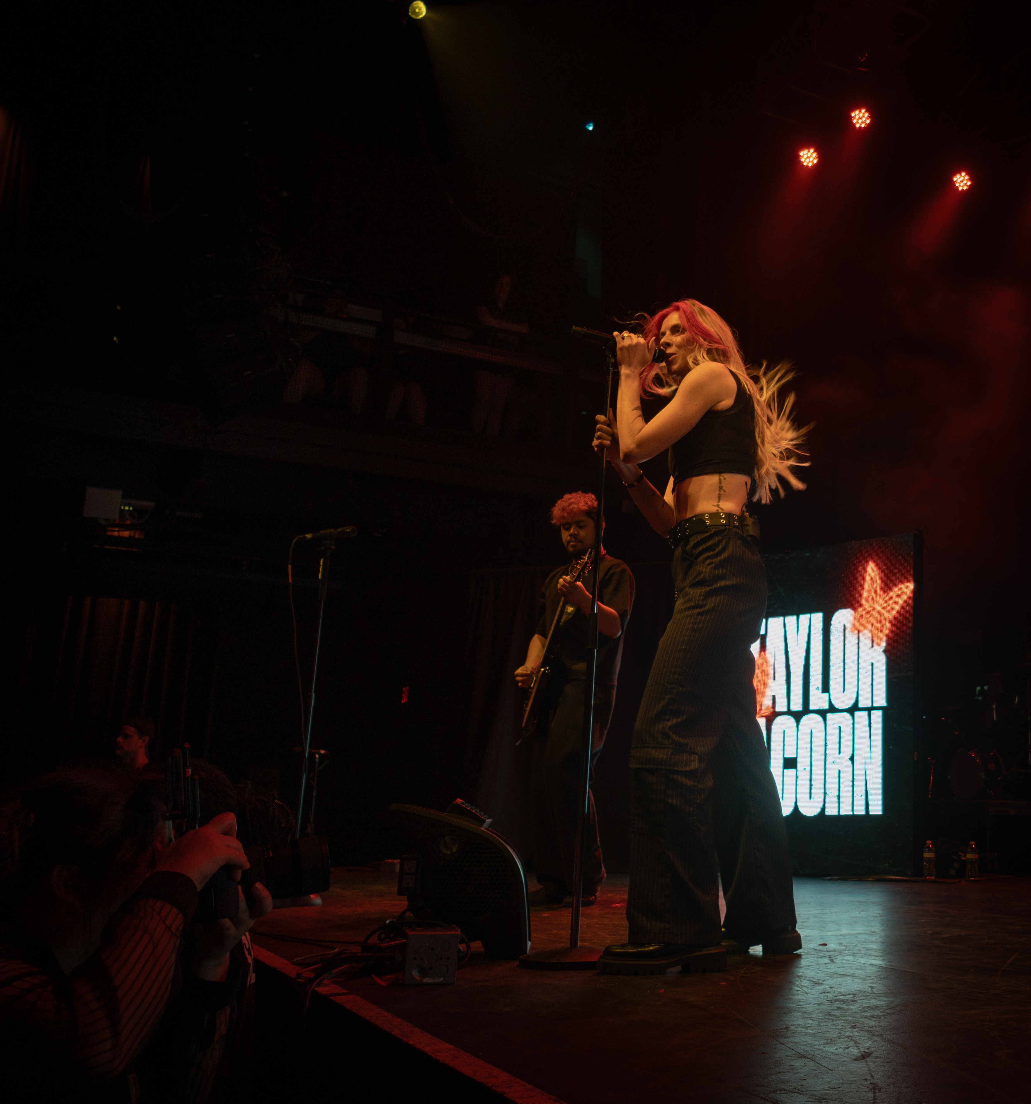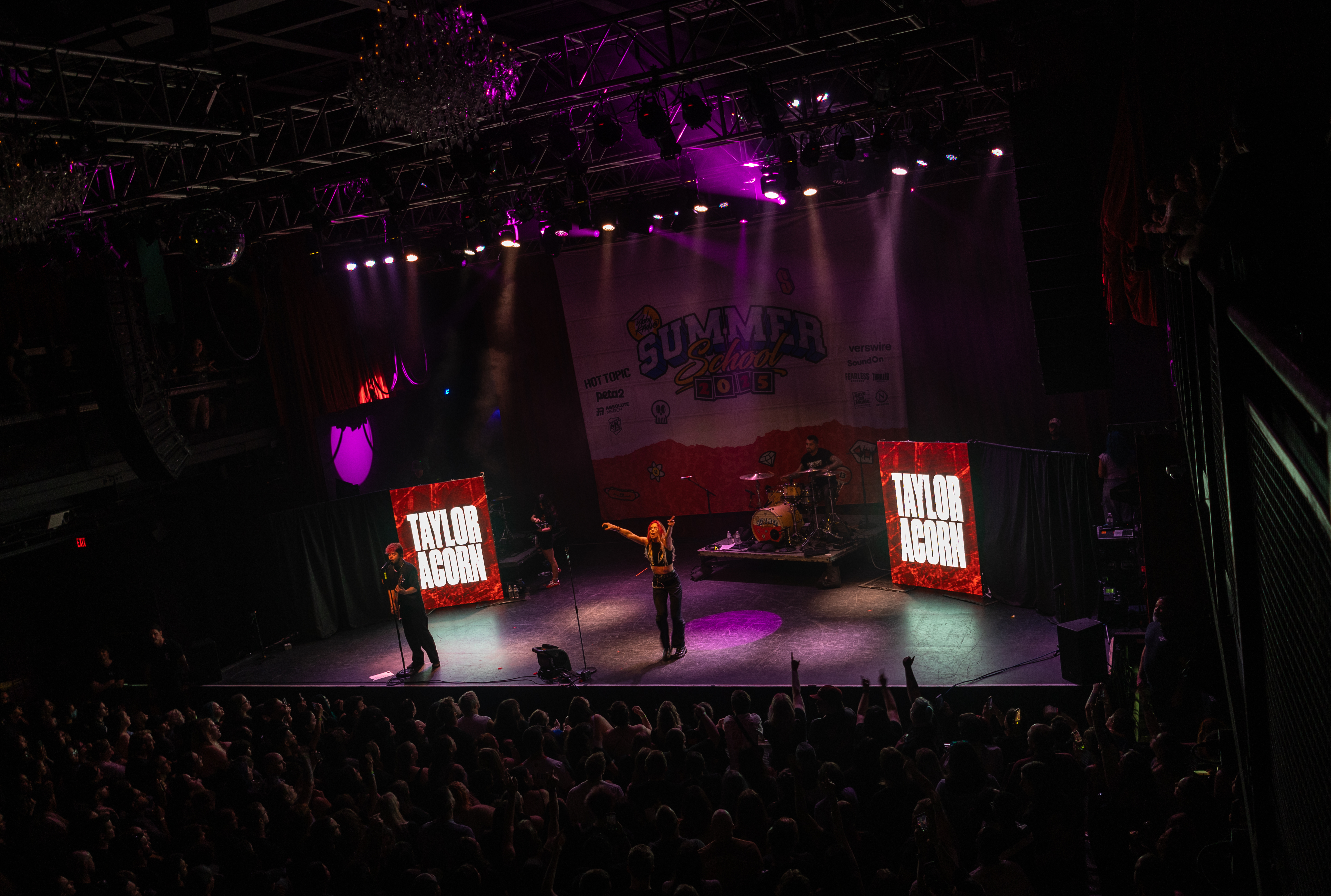 Displays of spinning neon smiley faces, skeleton hands lighting matches, and a bold Taylor Acorn logo beneath red flapping butterflies were rotated by the two screens framing the stage.