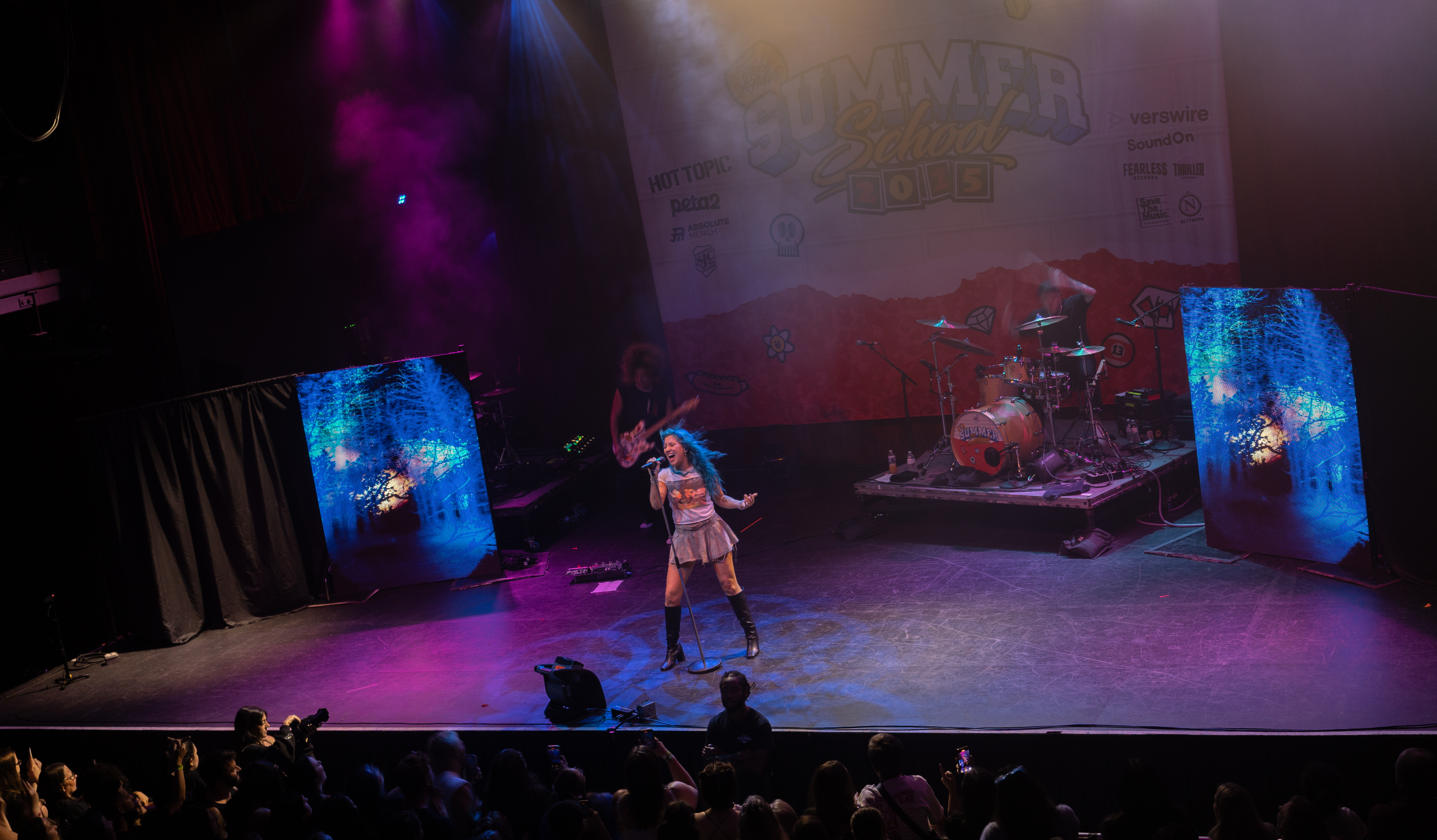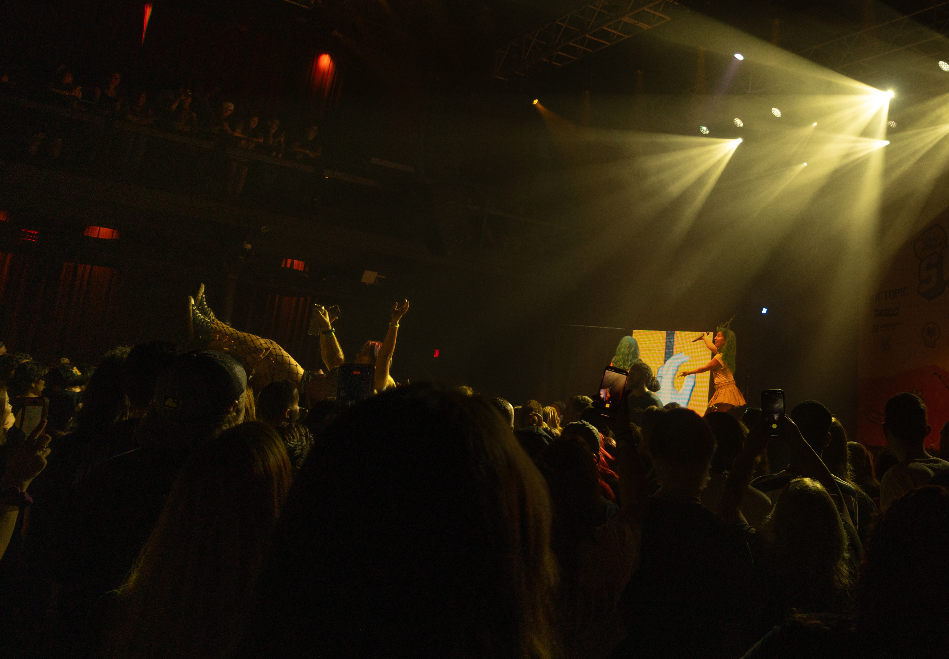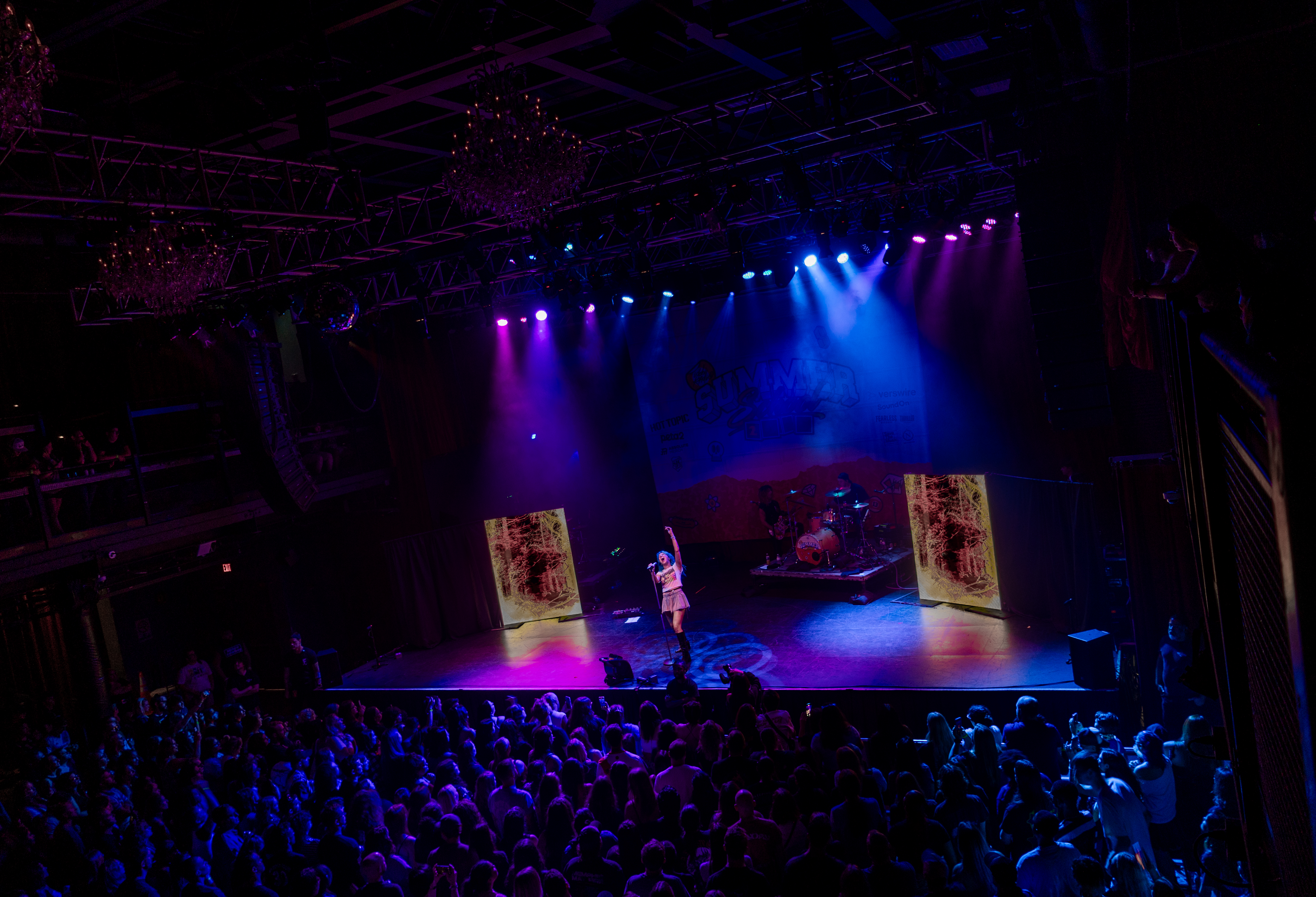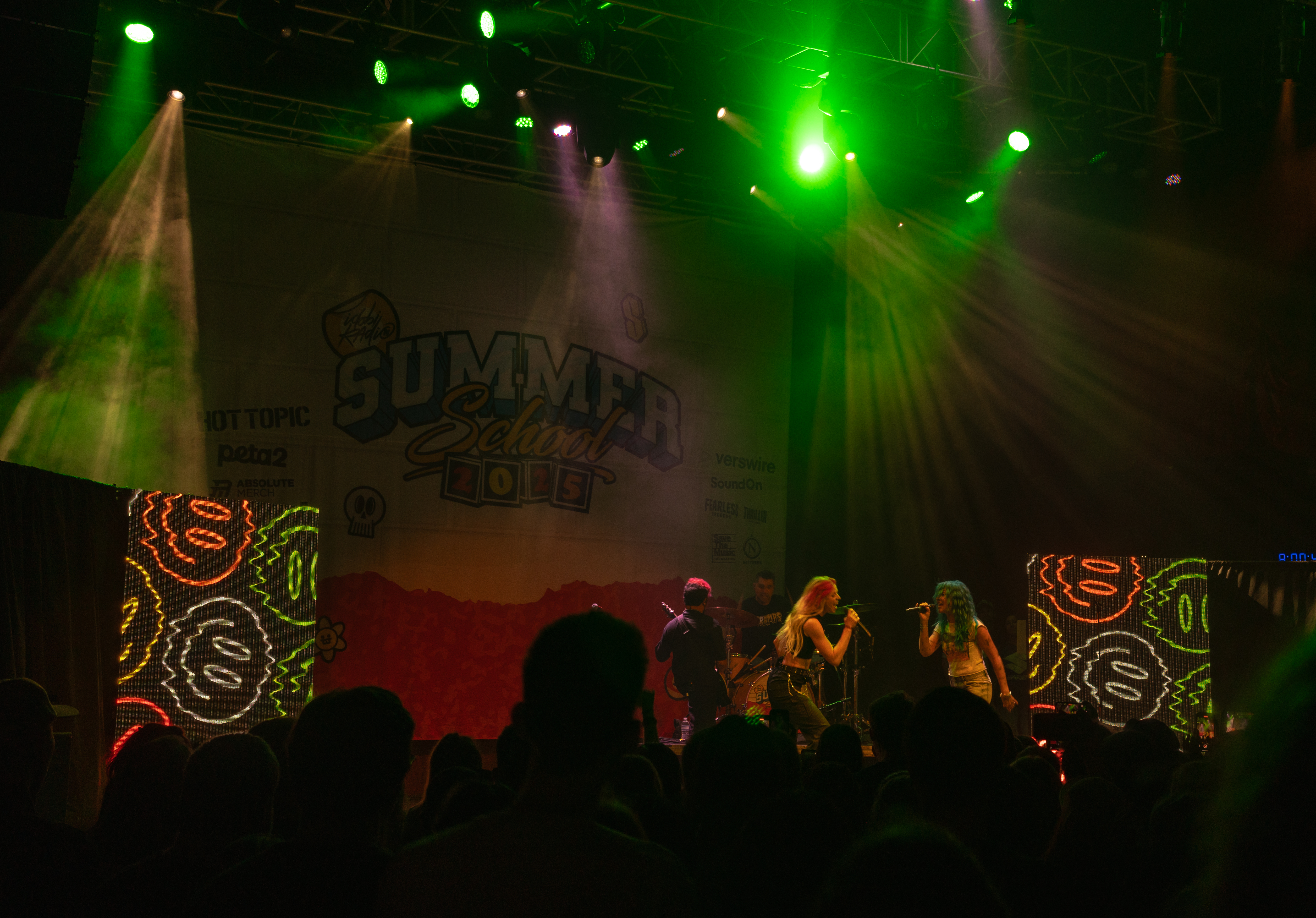 Displays of spinning neon smiley faces, skeleton hands lighting matches, and a bold Taylor Acorn logo beneath red flapping butterflies were rotated by the two screens framing the stage.