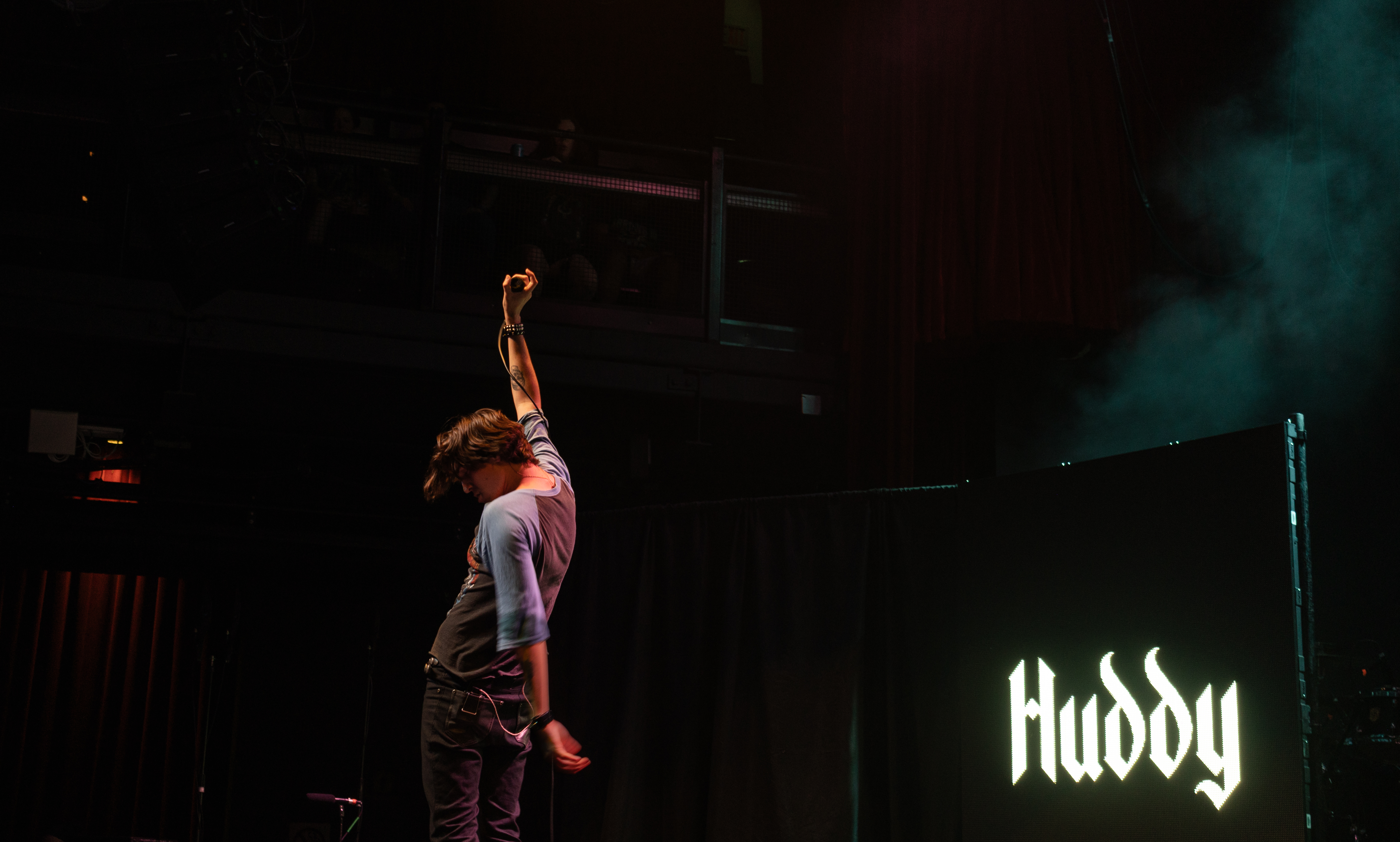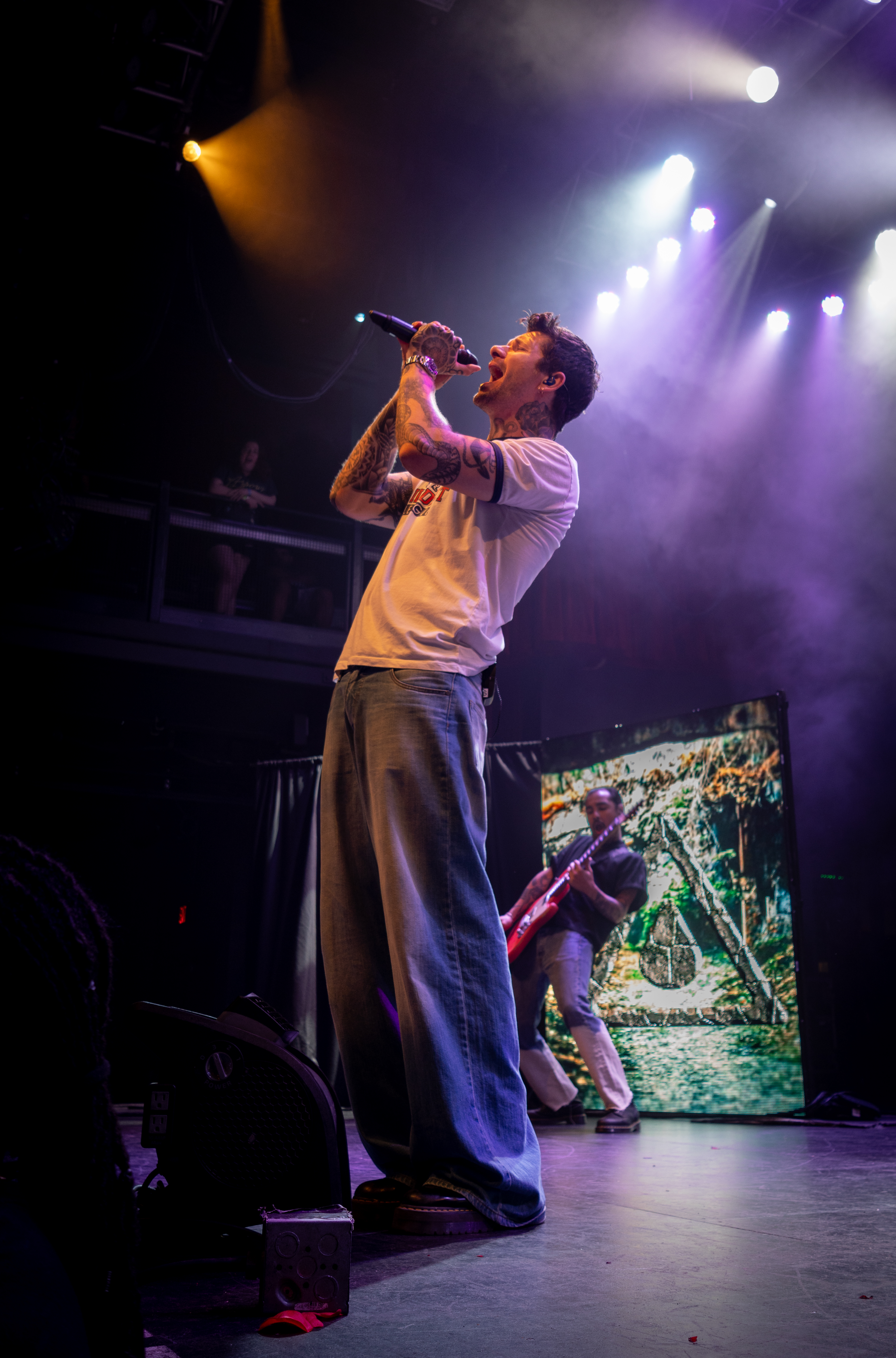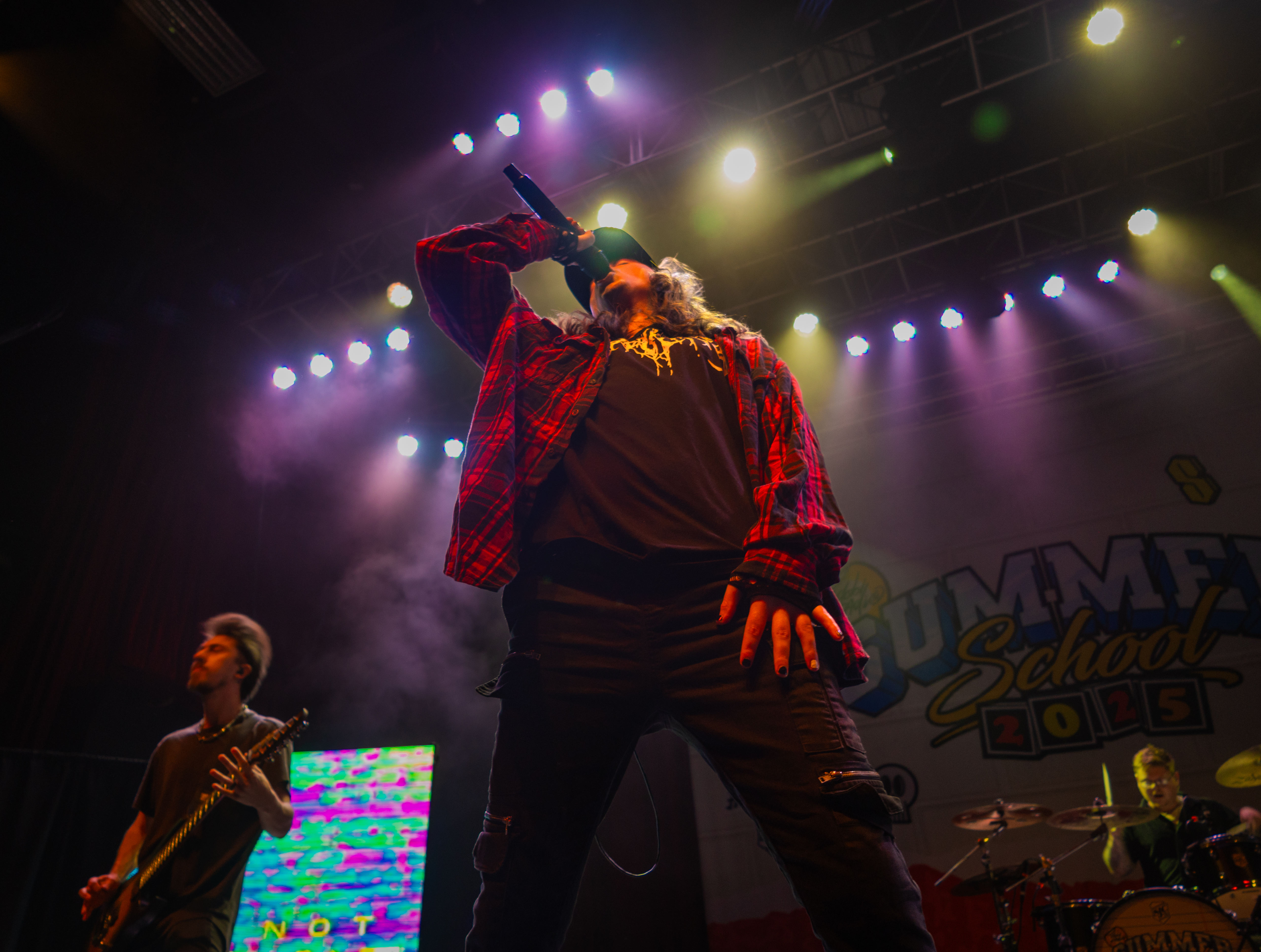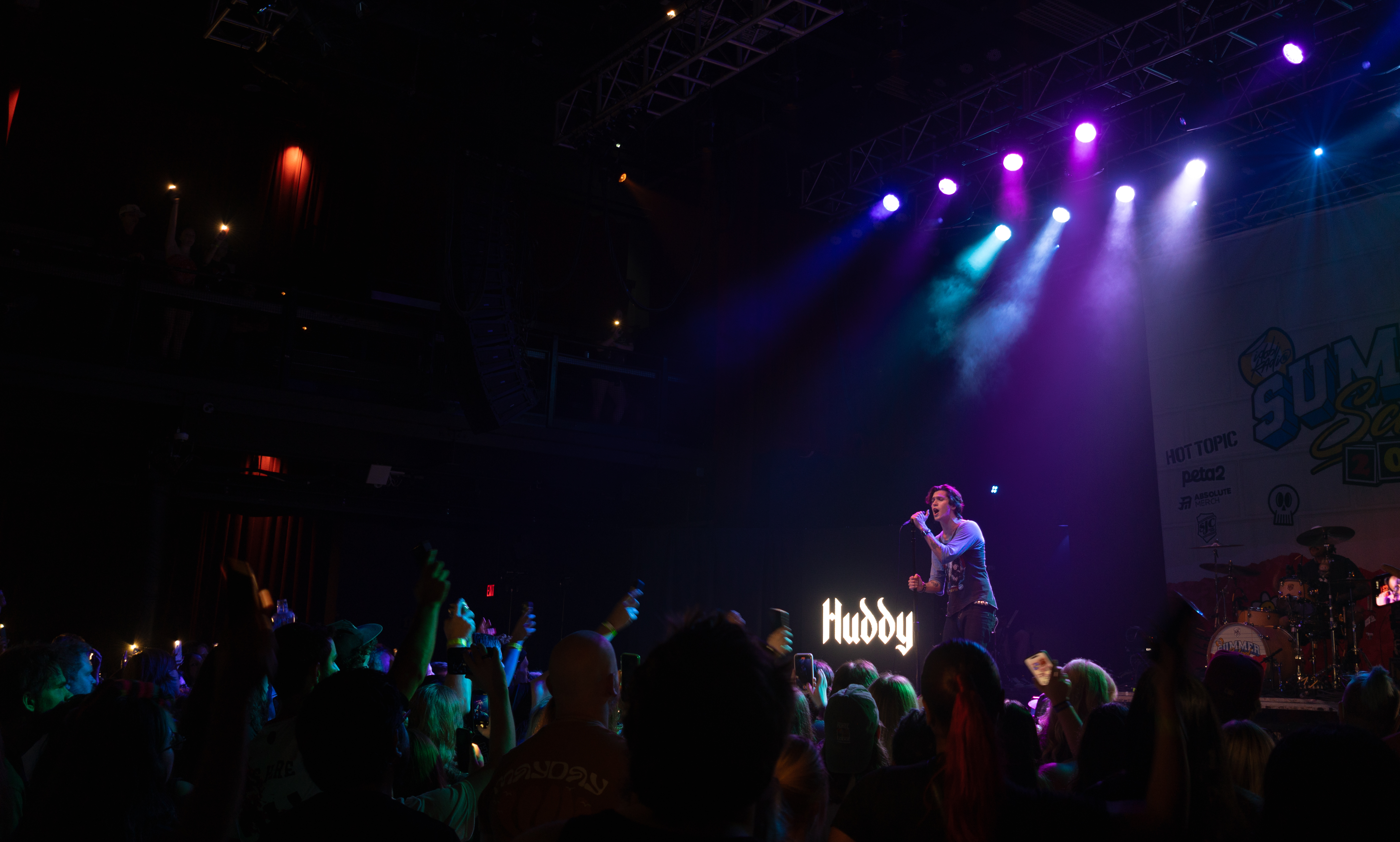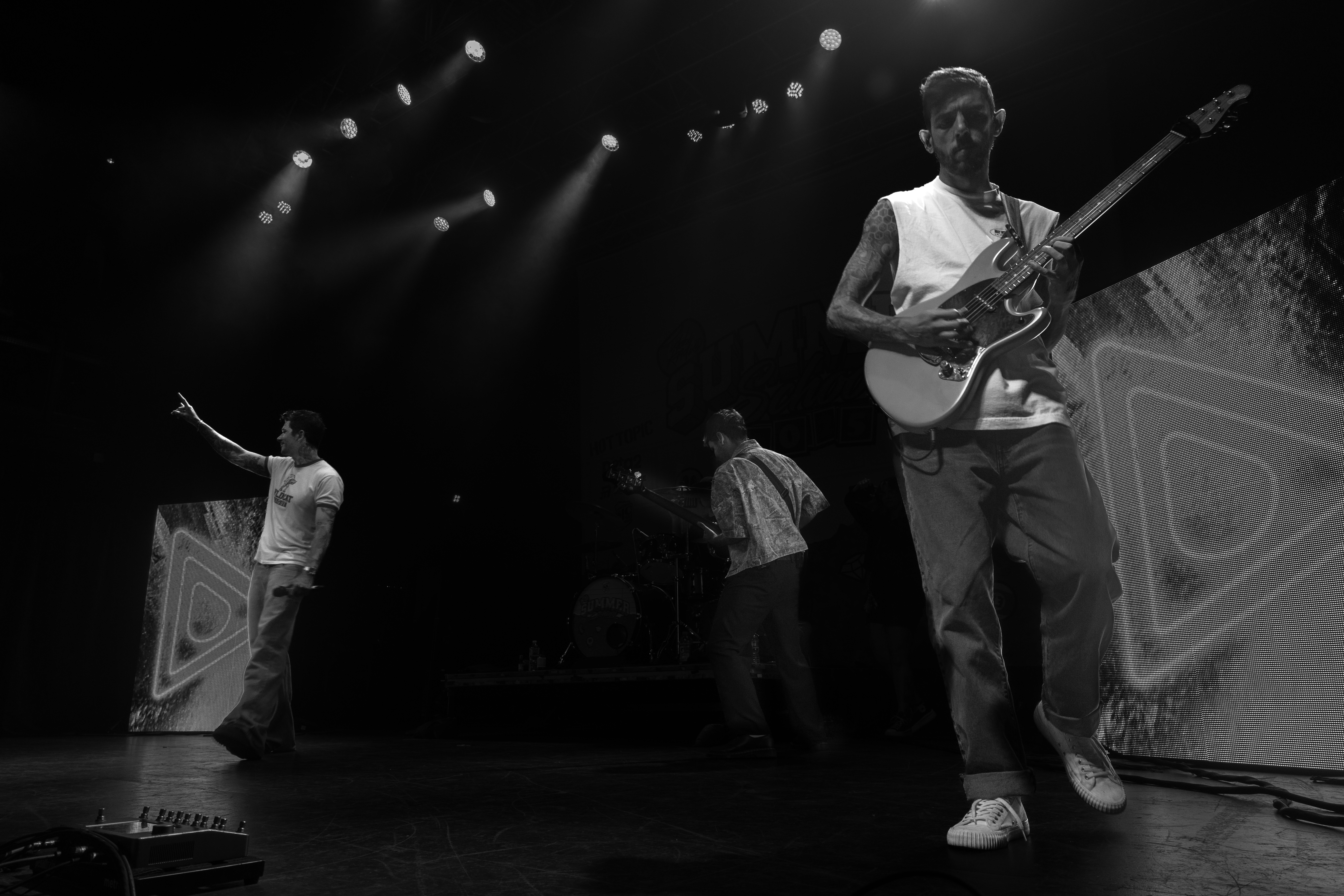 Displays of spinning neon smiley faces, skeleton hands lighting matches, and a bold Taylor Acorn logo beneath red flapping butterflies were rotated by the two screens framing the stage.