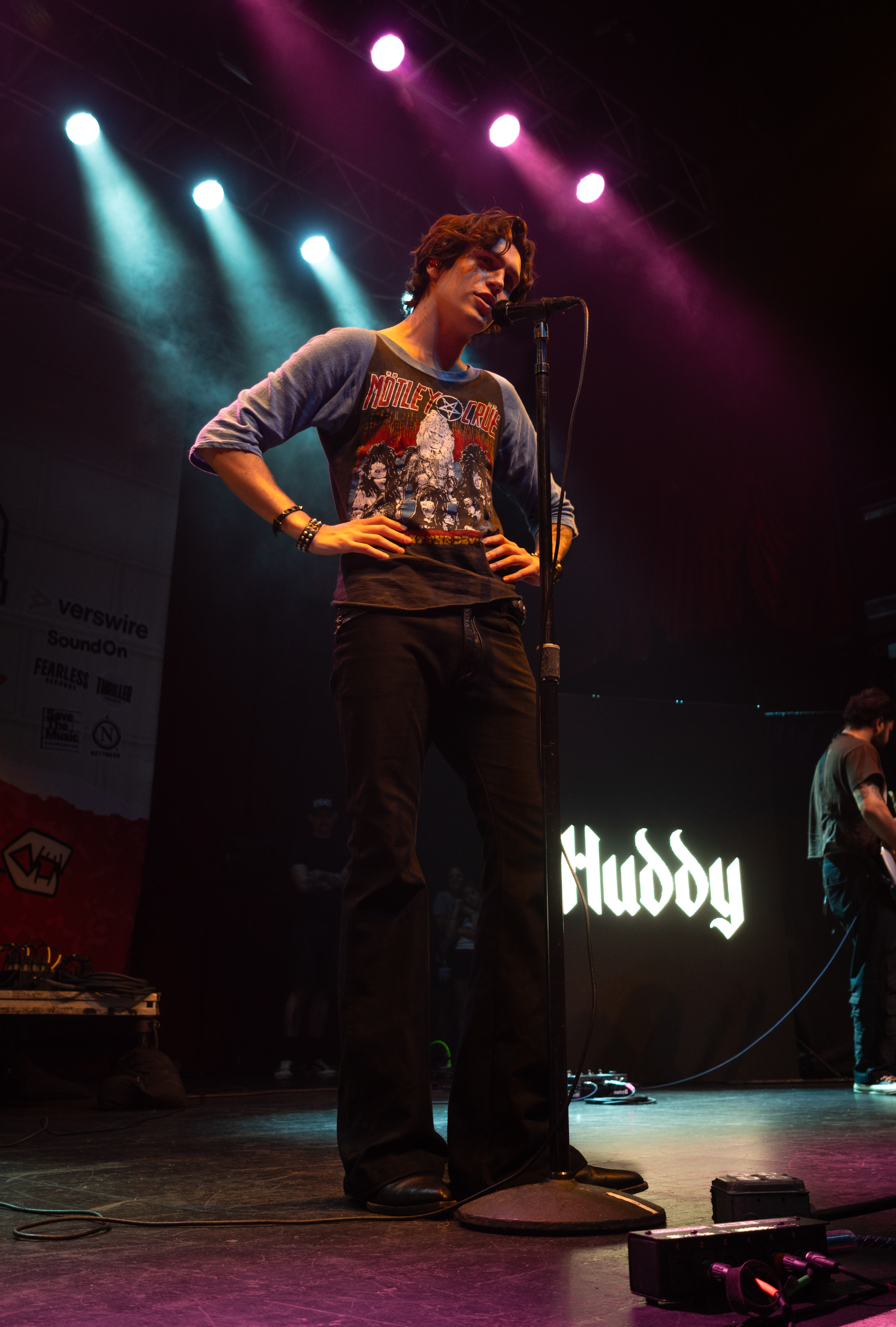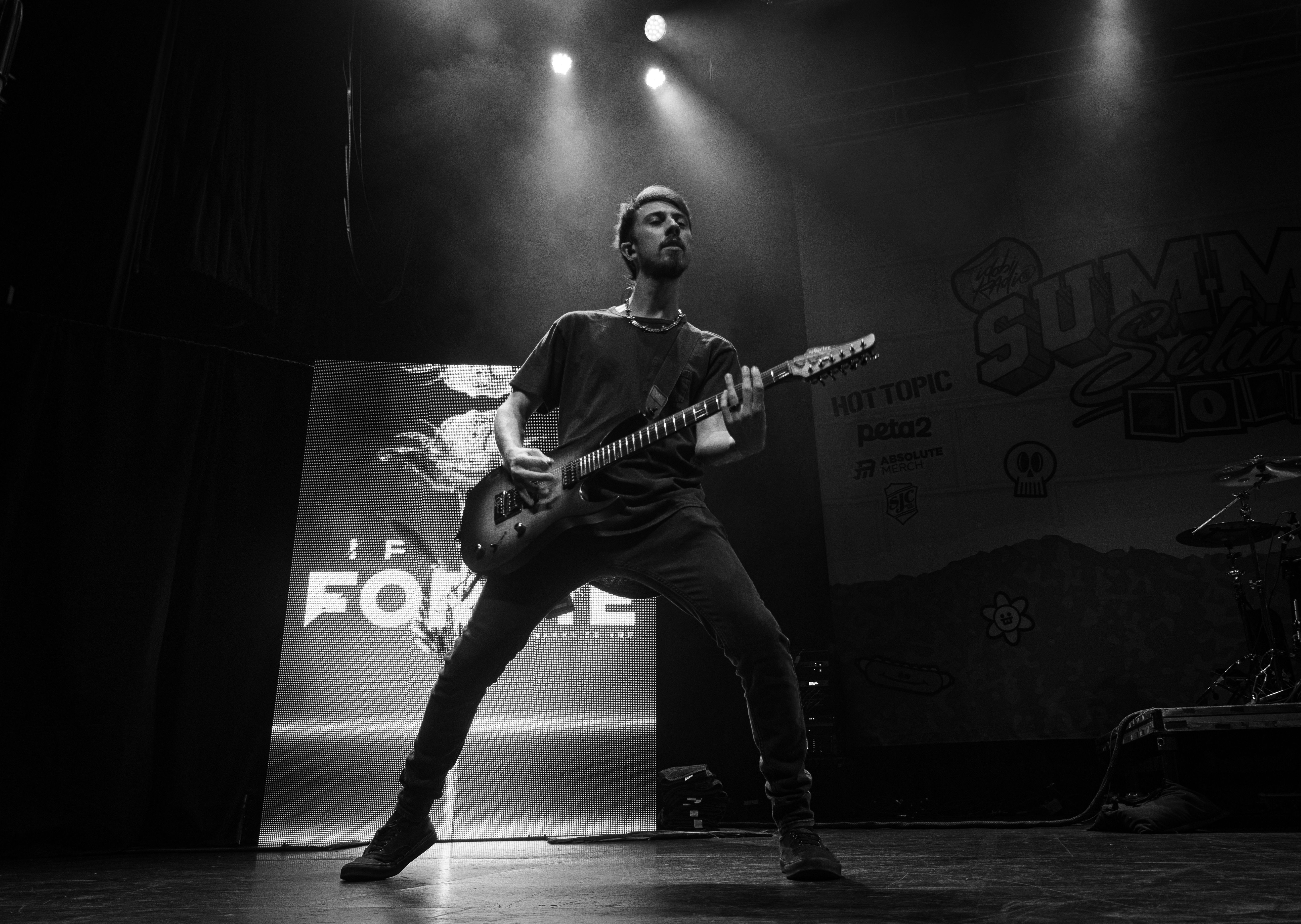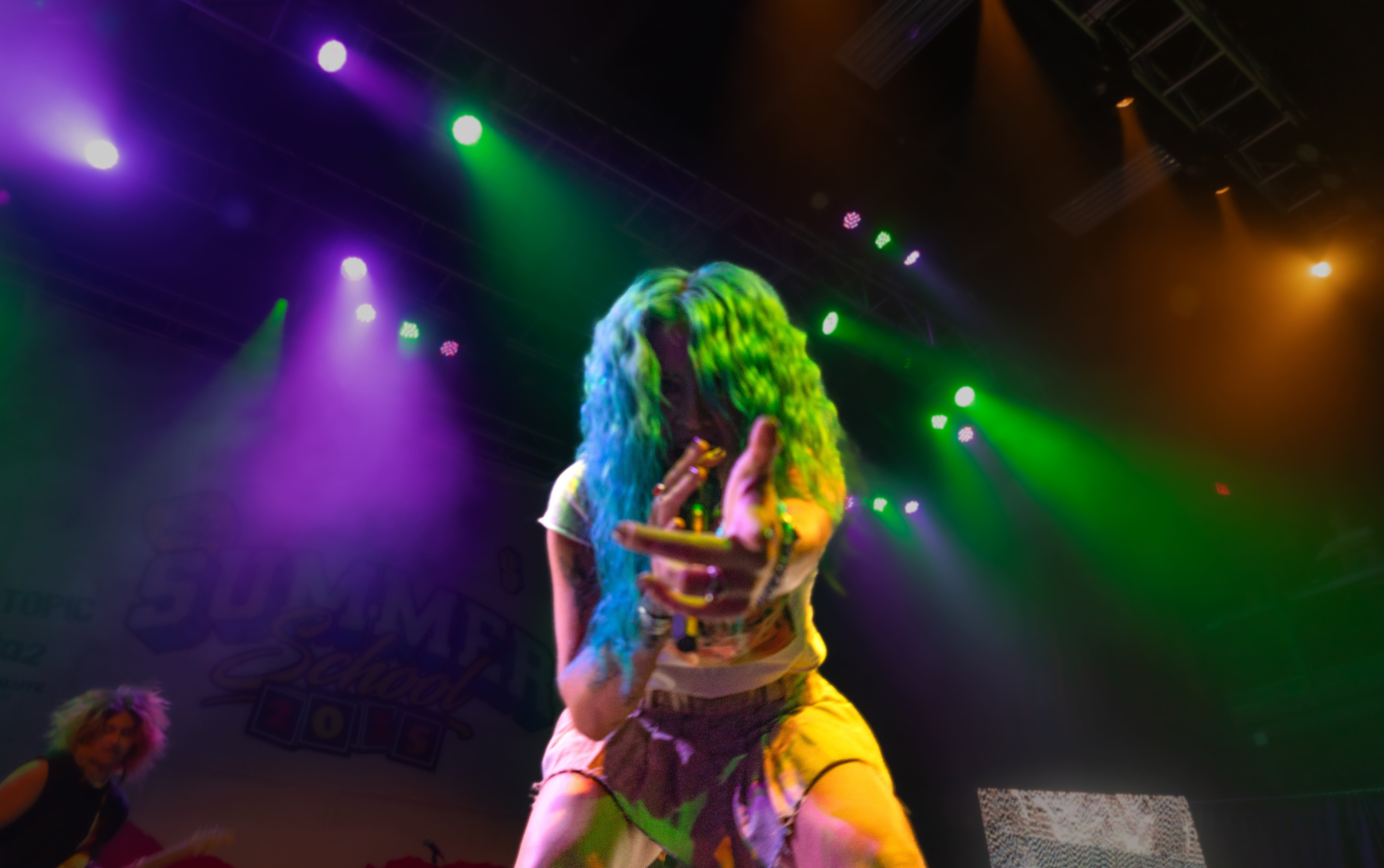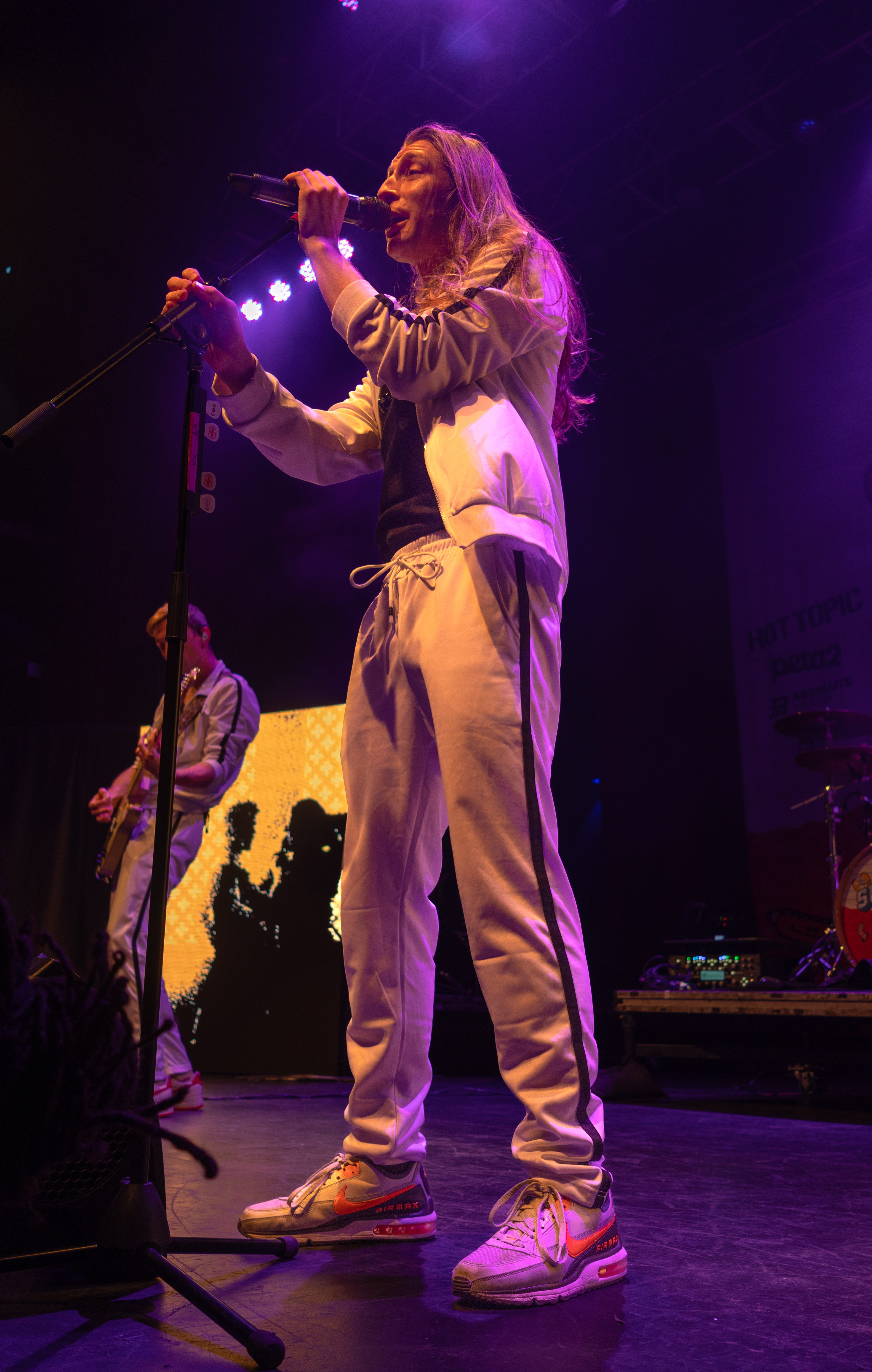 Displays of spinning neon smiley faces, skeleton hands lighting matches, and a bold Taylor Acorn logo beneath red flapping butterflies were rotated by the two screens framing the stage.
