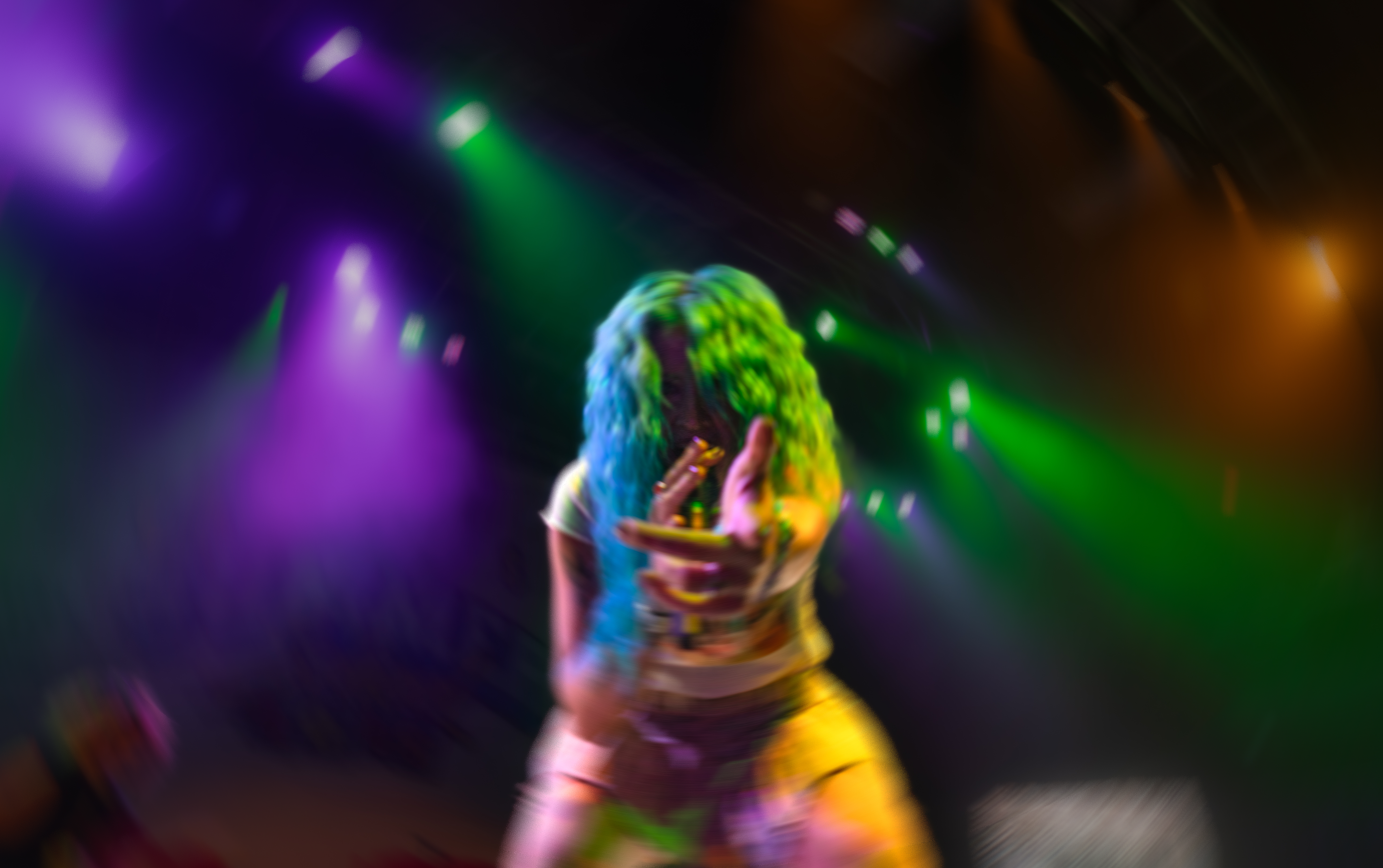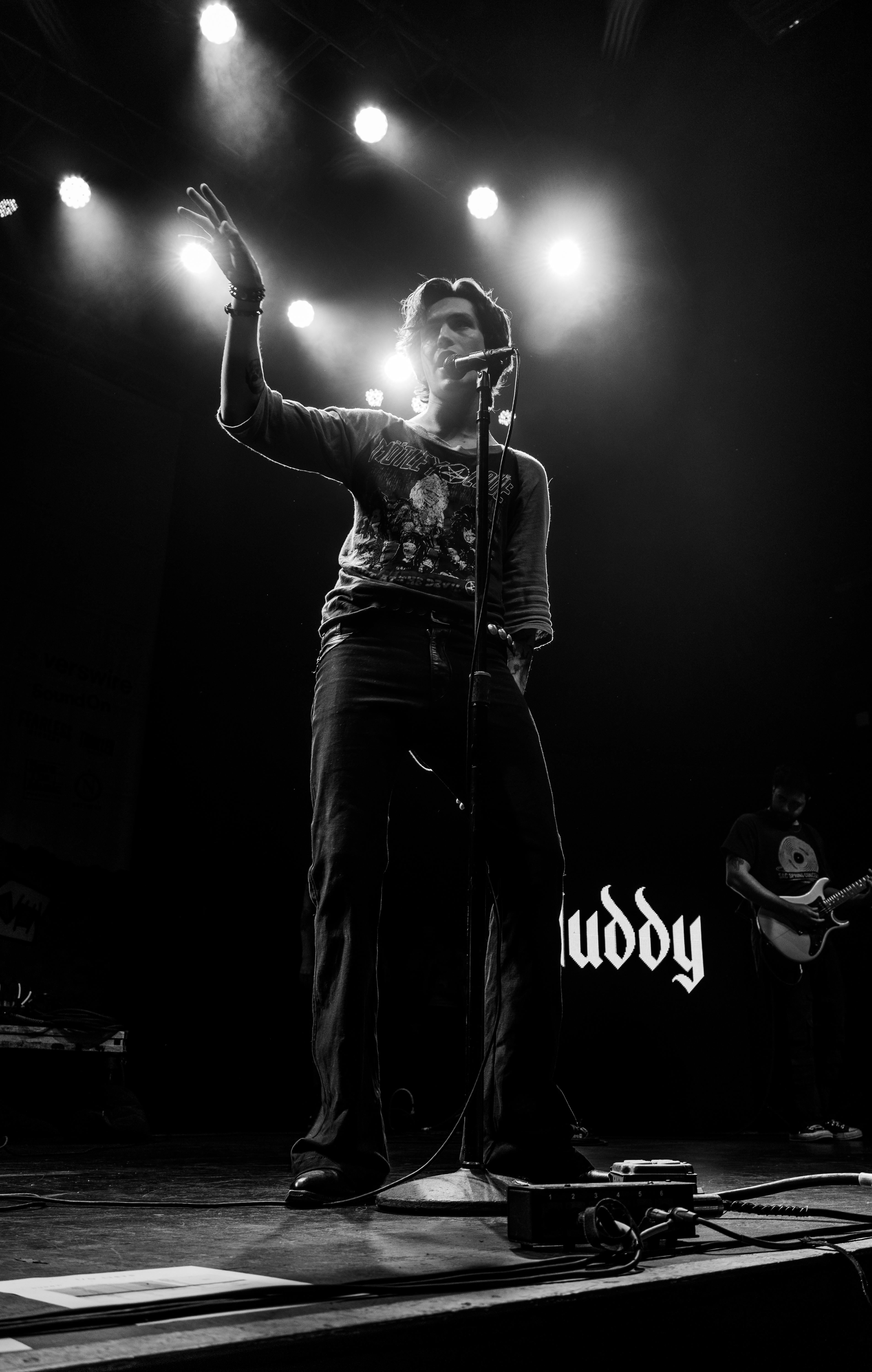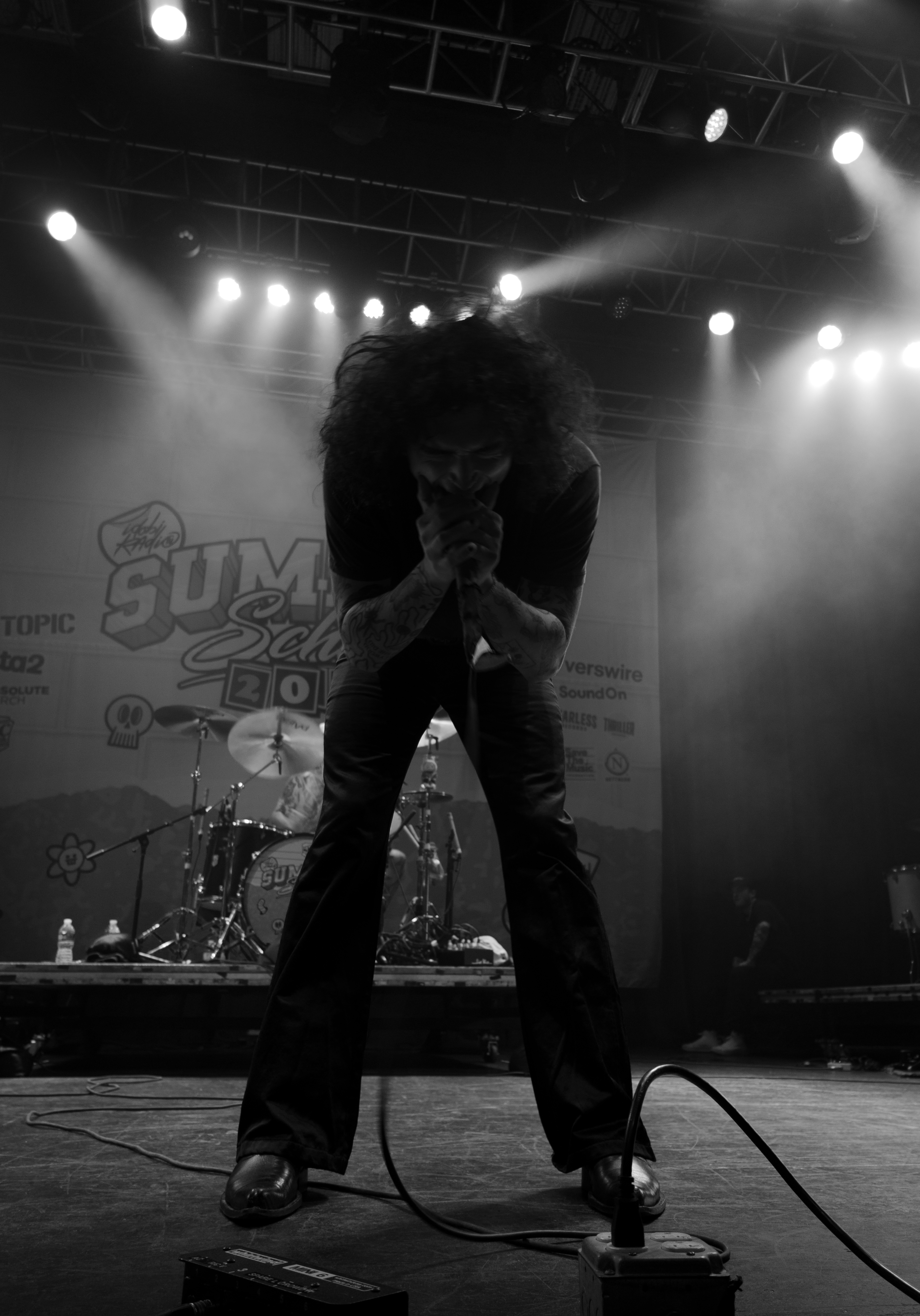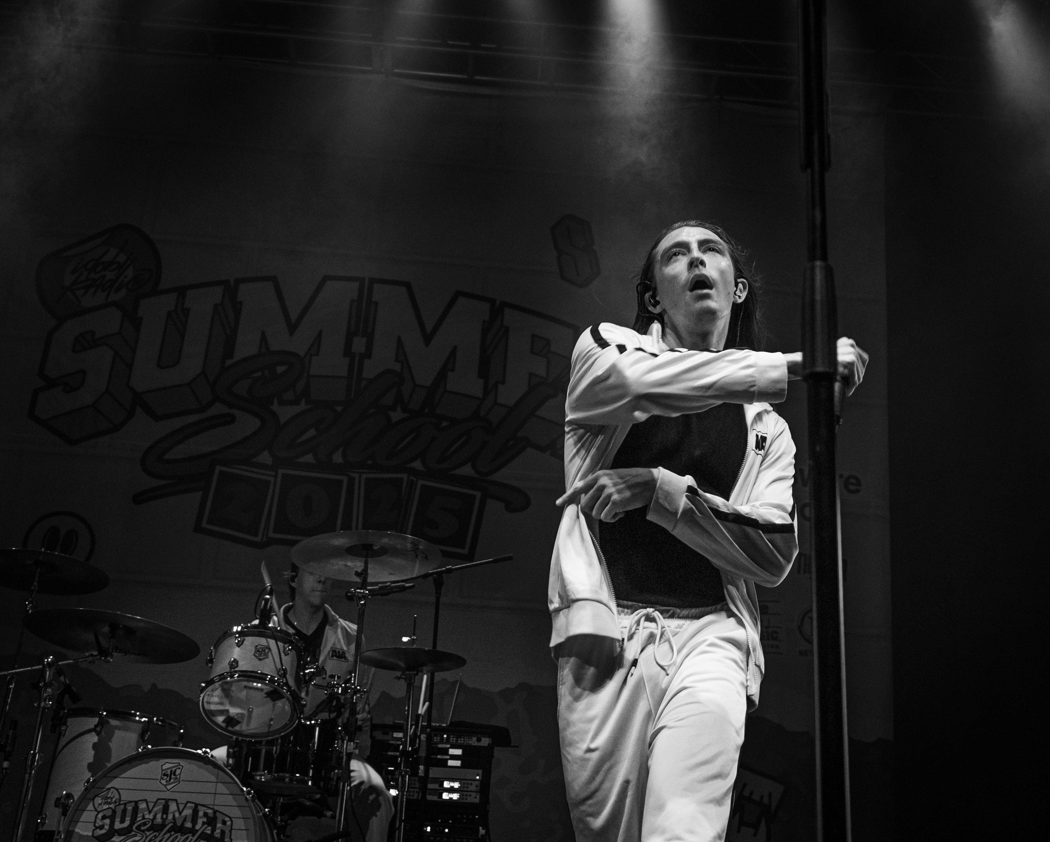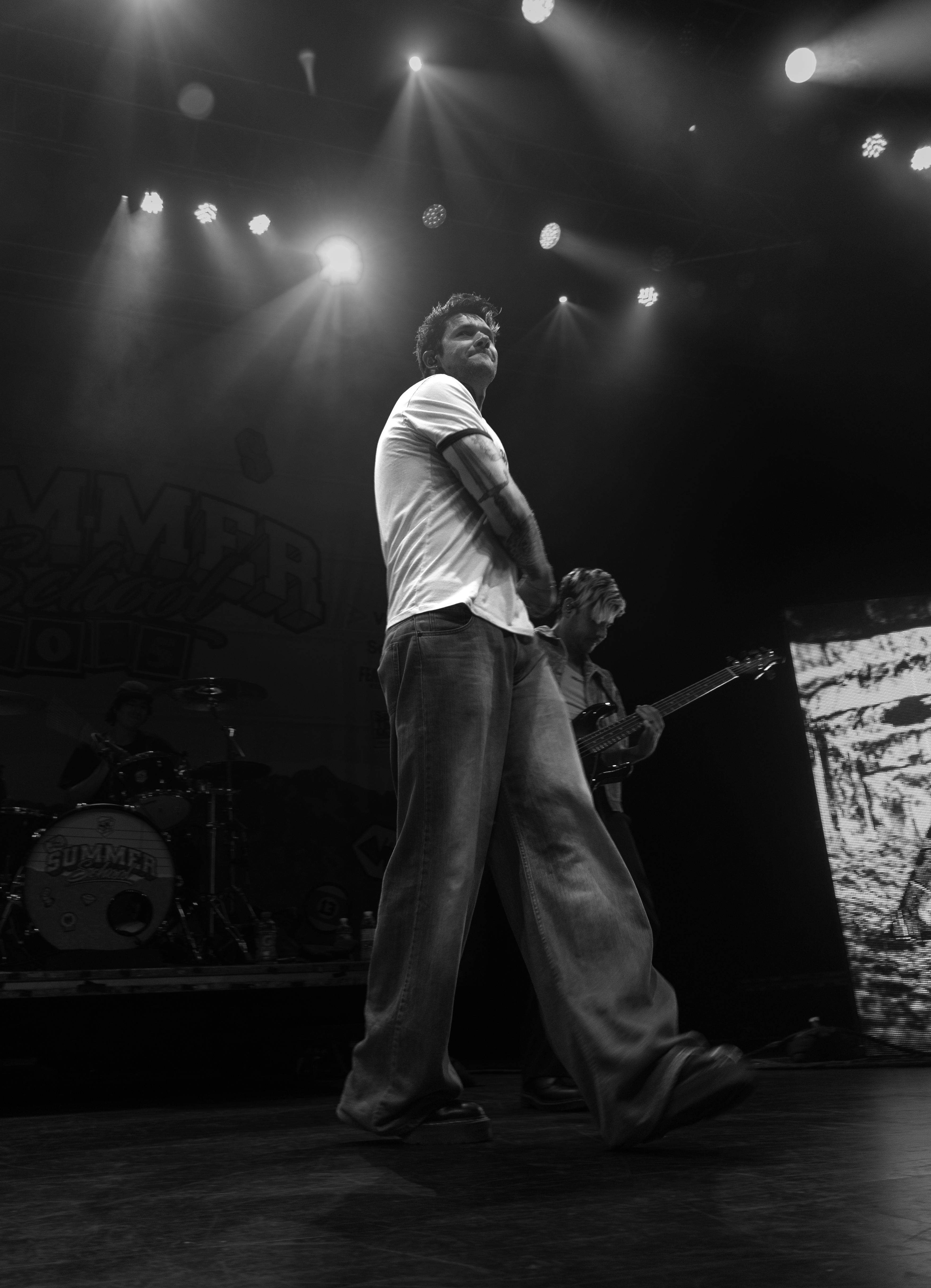 Displays of spinning neon smiley faces, skeleton hands lighting matches, and a bold Taylor Acorn logo beneath red flapping butterflies were rotated by the two screens framing the stage.