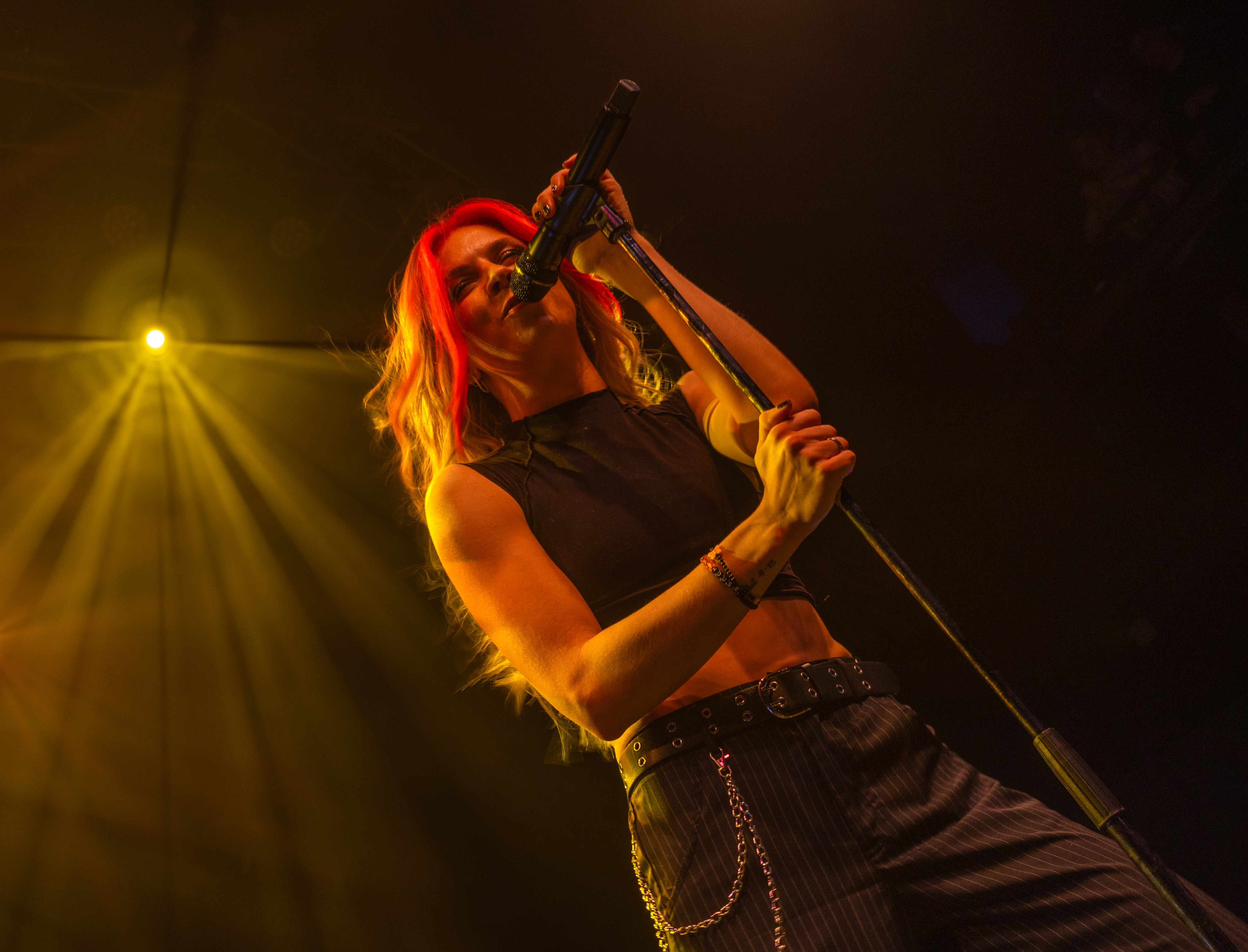 The stage fans gave Acorn’s red-streaked hair a life of its own as she gently sang “Burning House” from center stage, hands sliding along her microphone stand. The top of her guitarist’s hair was dyed red too, matching hers.