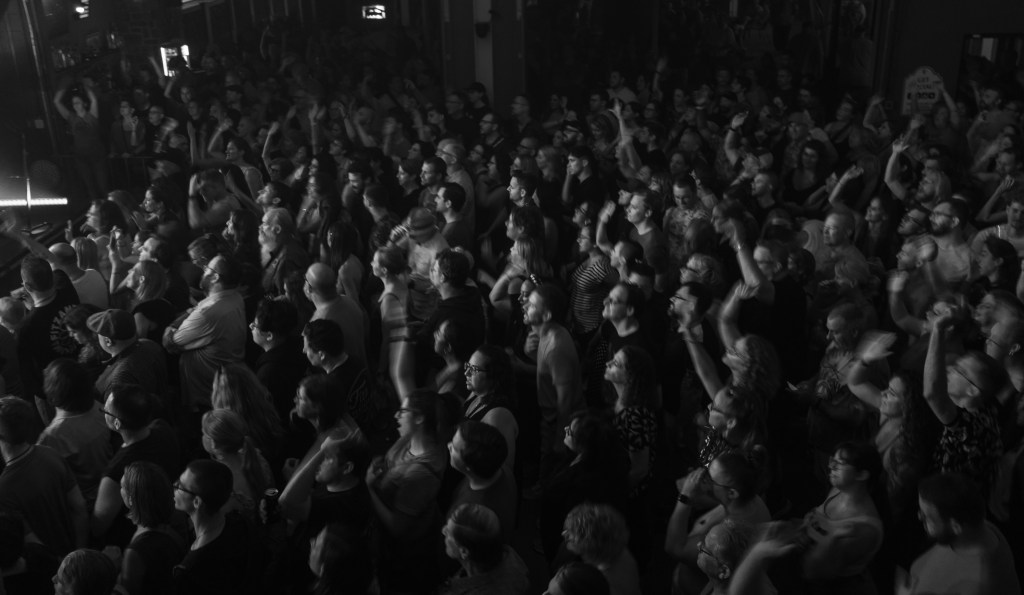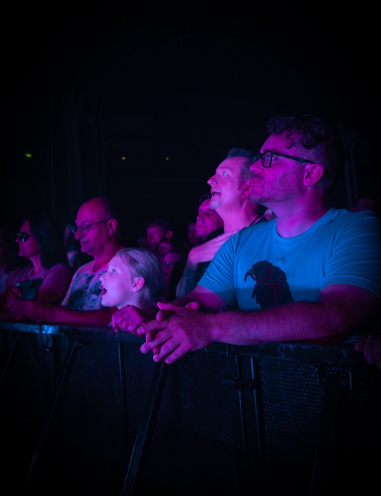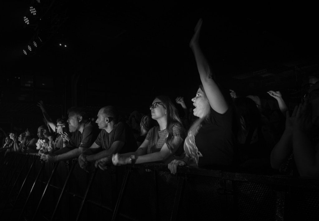 The indie pop band drew an audience of all ages. A young girl and her father fed off each other’s enthusiasm in the front row; a young boy wielded a hand-drawn “It’s My First Concert!” poster broader than he was tall. Toward the back of the pit, an older couple jumped together next to a side-stepping gentleman in a bowler hat that matched saxophonist James King’s.