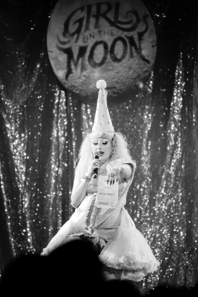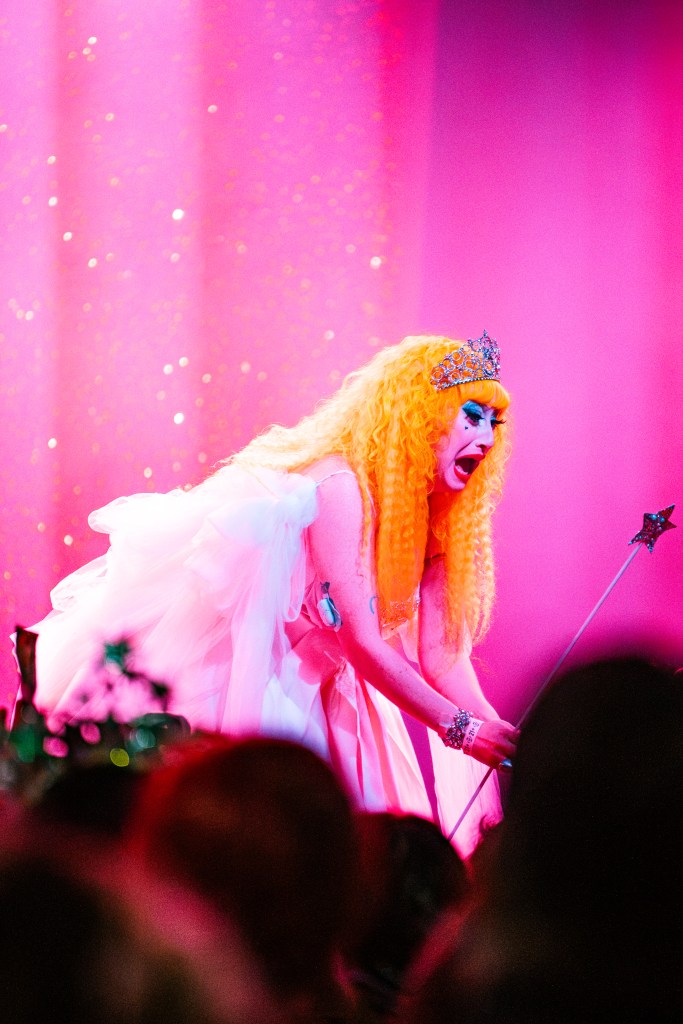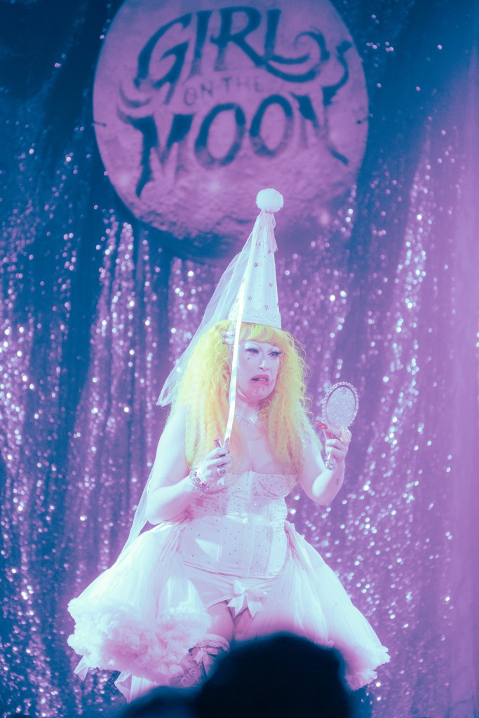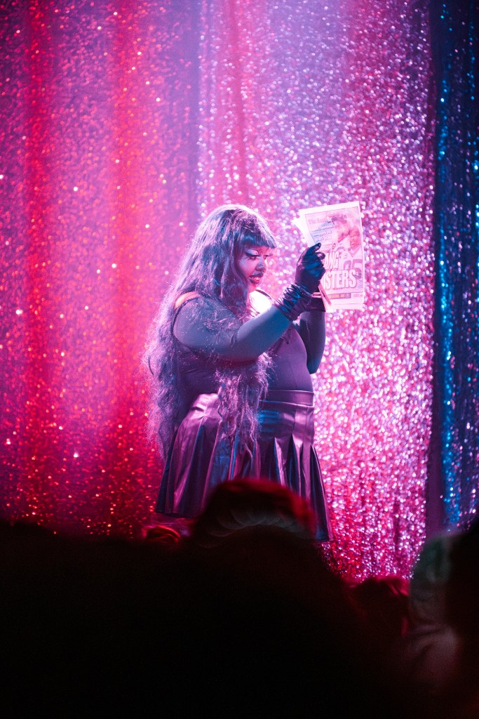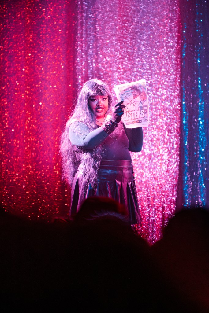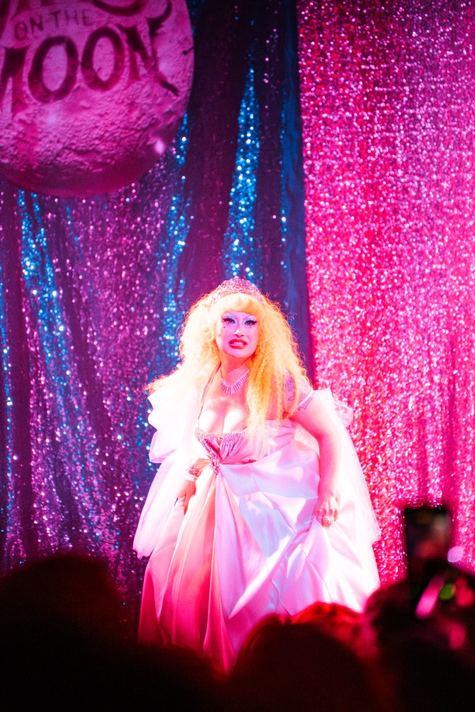 Harsh Babe took the stage soon after and put on an incredible Wicked-inspired number set to “The Subway” by Chappell Roan. The performance was interactive and emotional, complete with a gorgeous Glinda gown and witch on a broomstick “flying” through the crowd (courtesy of Harsh Babe’s fellow performer and friend, I’m Baby). The number also featured other local talent, which emphasizes the inclusive yet tight-knit community that Harsh Babe has created throughout her time in Brooklyn. Harsh Babe’s second, equally campy yet emotional number was set to Lily Allen’s “Pussy Palace.”