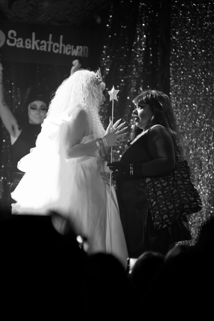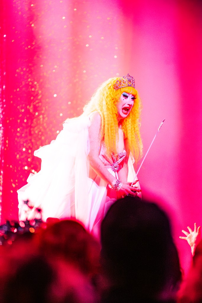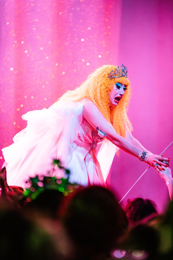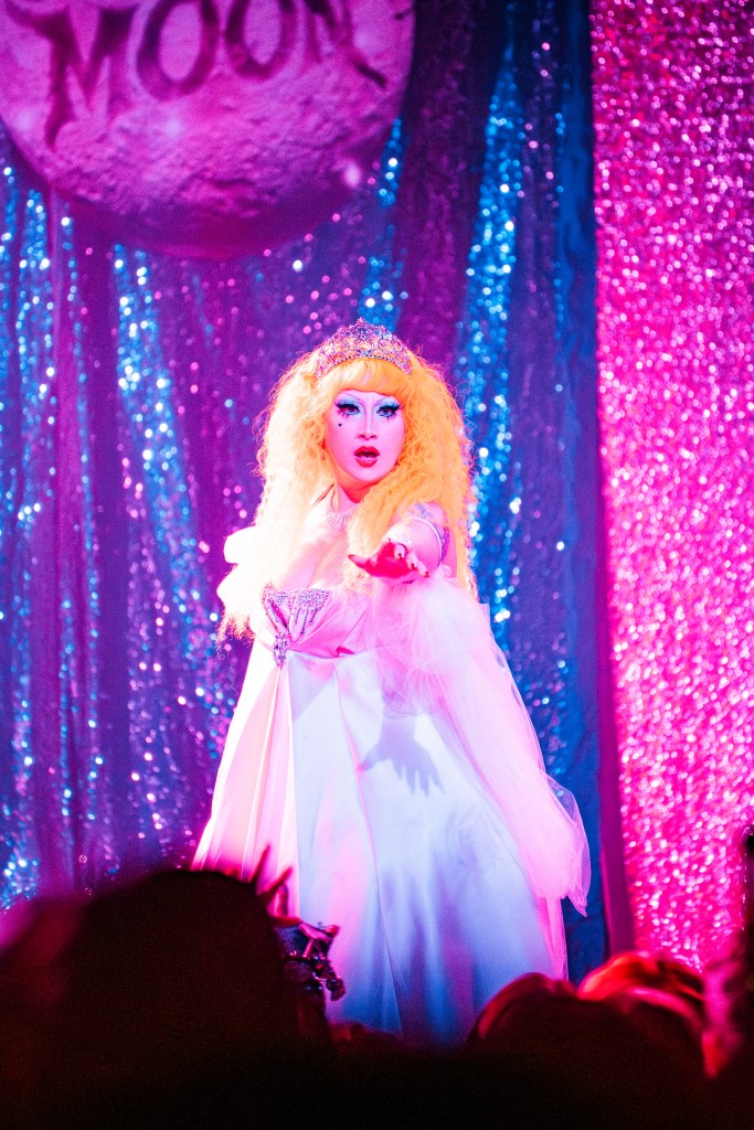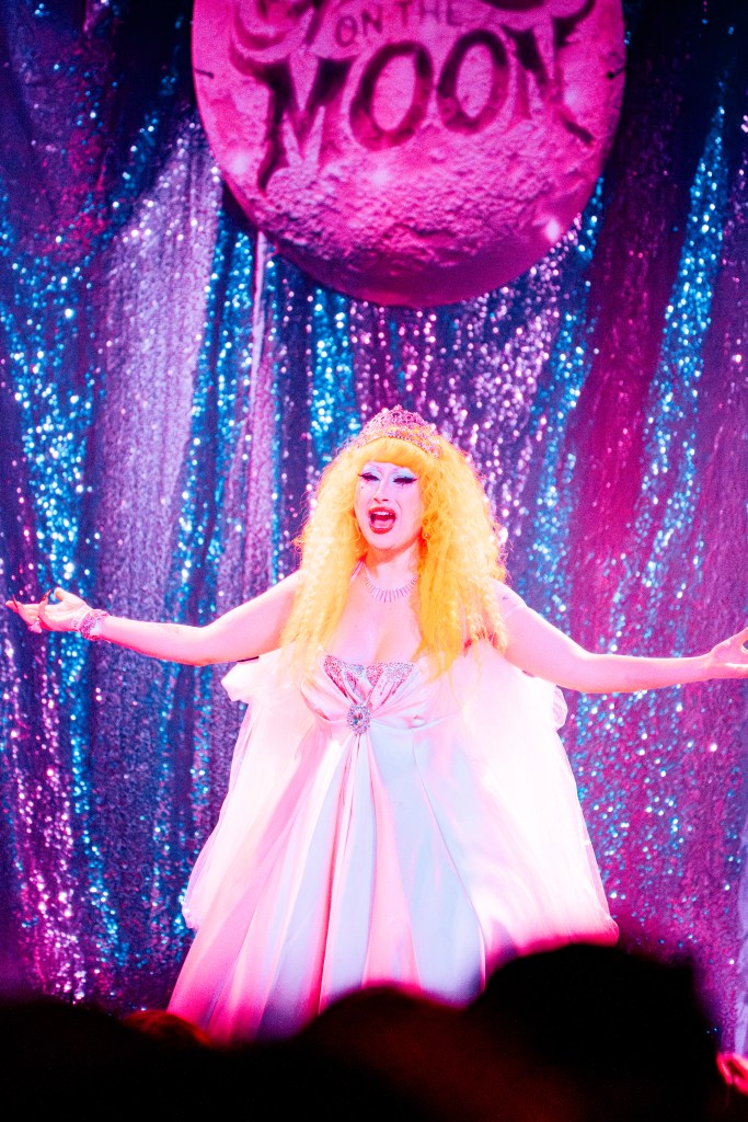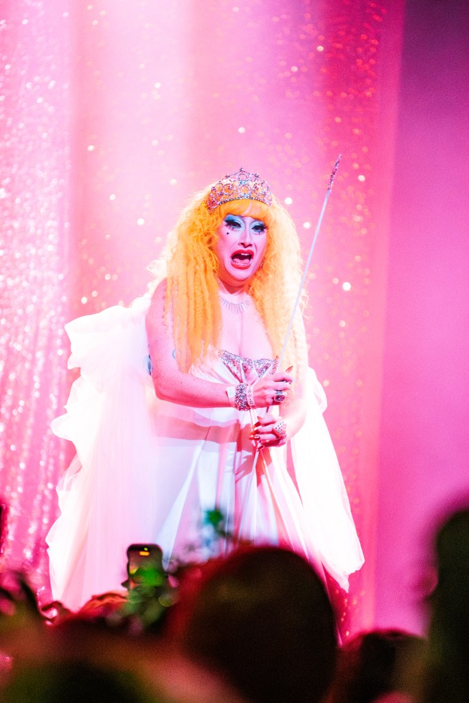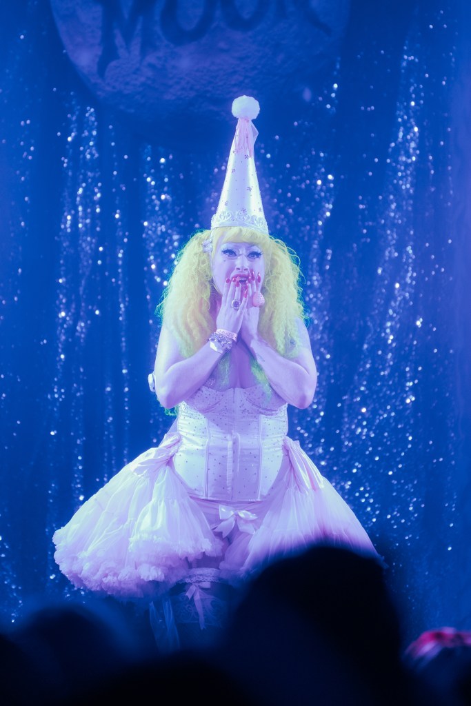 Harsh Babe took the stage soon after and put on an incredible Wicked-inspired number set to “The Subway” by Chappell Roan. The performance was interactive and emotional, complete with a gorgeous Glinda gown and witch on a broomstick “flying” through the crowd (courtesy of Harsh Babe’s fellow performer and friend, I’m Baby). The number also featured other local talent, which emphasizes the inclusive yet tight-knit community that Harsh Babe has created throughout her time in Brooklyn. Harsh Babe’s second, equally campy yet emotional number was set to Lily Allen’s “Pussy Palace.”